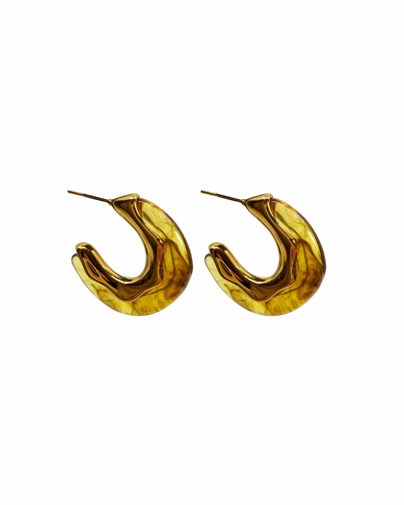 De glänsande metallpartierna i rostfritt stål med äkta guldplätering ger örhängena en exklusiv finish och skapar en vacker kontrast mot den mörka akrylen. Kombinationen av guld och coffee-toner gör smycket lätt att matcha med både neutrala och varma färger, samtidigt som designen lyfter ansiktet med en elegant, modern känsla.