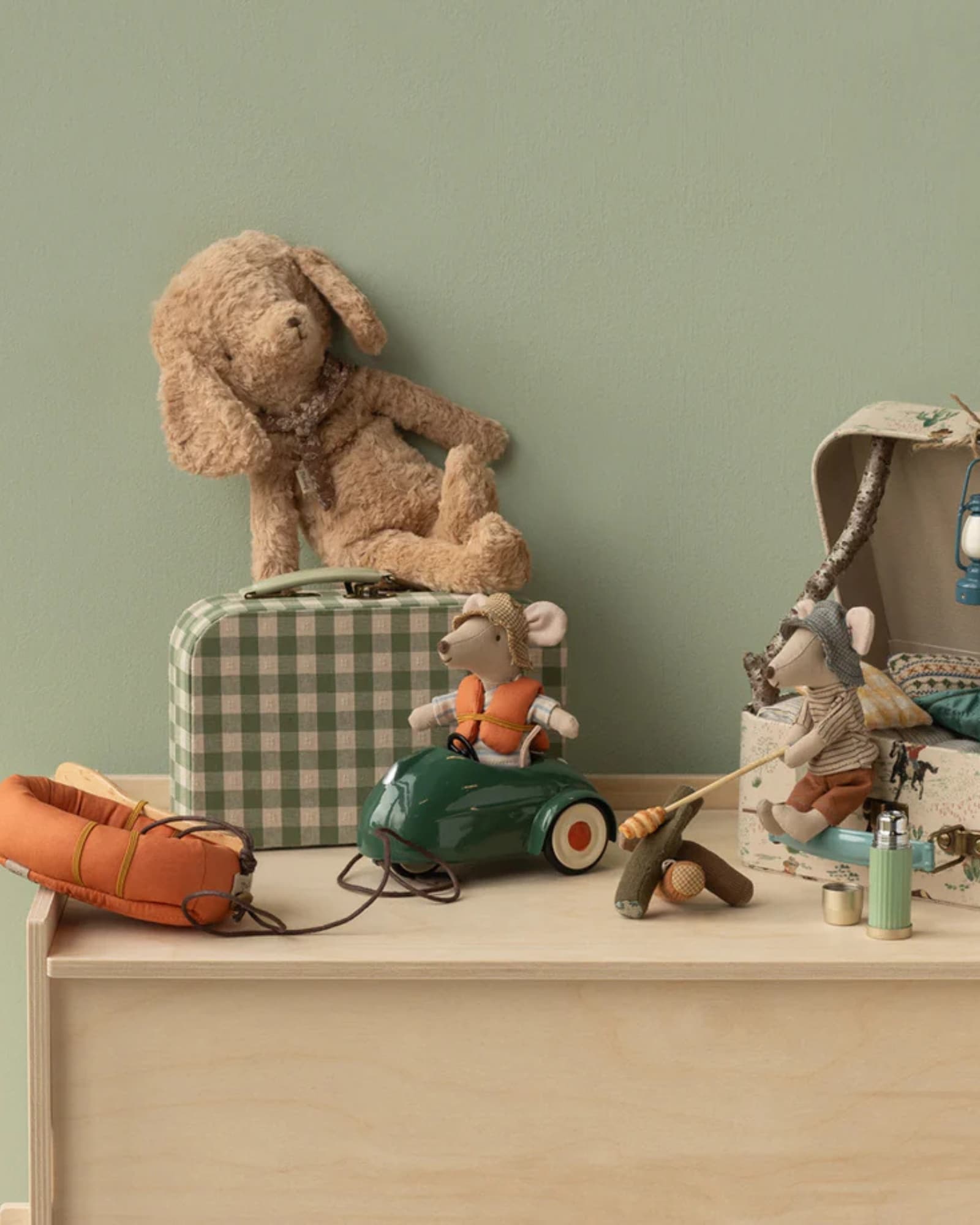Metallbilen är ett utmärkt transportmedel för alla möss. Den passar alla möss i storlekarna lillebror/lillesyster, storebror/storesyster och mamma/pappa. Det medföljande snöret kan fästas under bilen så att barnet kan dra bilen.