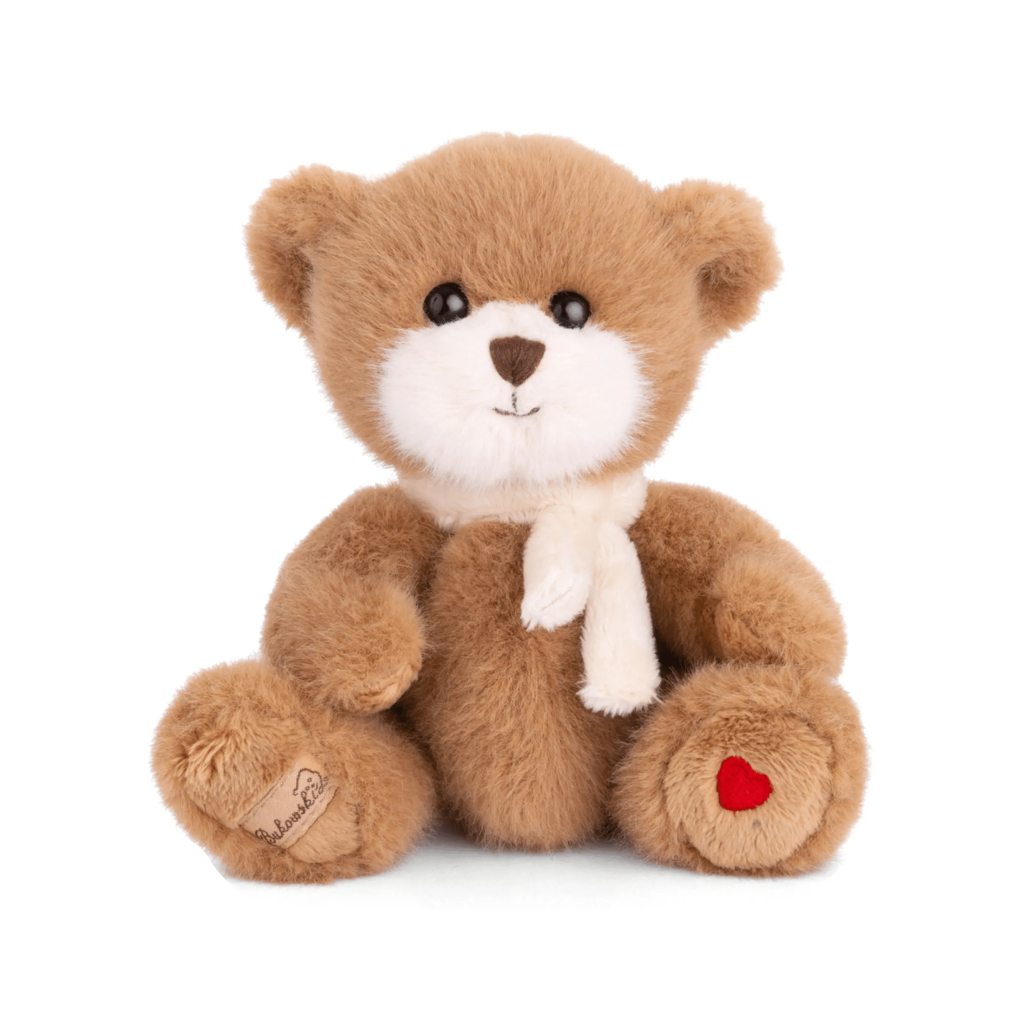 Nallen har ett hjärta tryckt på foten, vilket ger en extra gullig och personlig touch. Dessutom består den av mjukt plyschmaterial av polyesterfiber, vilket gör den behaglig att ta i och krama. Ögonen av akryl ger nallen ett vänligt och levande uttryck, samtidigt som de små plastpärlorna av polyetenresin i botten gör den stadig när den sitter. Därför kan barn leka med den utan problem, och vuxna uppskattar den som en söt dekorationsvän.