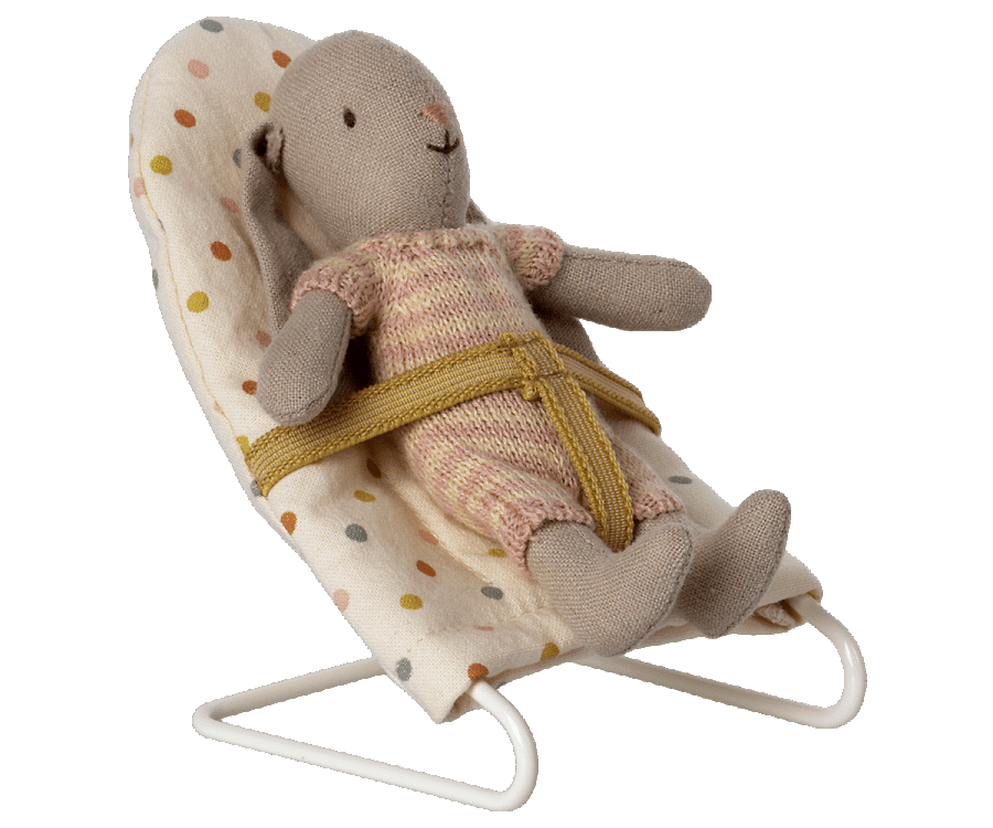 Med denna barnvakt är det lätt att få dina små vänner att sova. Basen är gjord av metall och täckt av det vackraste prickiga tyget. Stolen passar babymöss och mikrostora kaniner och kaniner perfekt.