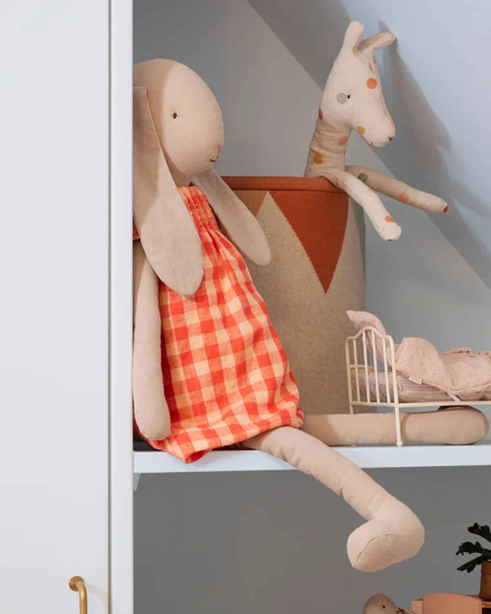 Kanin- och kaninkollektionen är tillverkad av mjukt och naturligt linne- och bomullstyg som både känns behagligt och ser fint ut. Denna charmiga kanin är klädd i en vacker klänning med fina smockdetaljer – en underbar följeslagare för lek, kramar och fantasi.