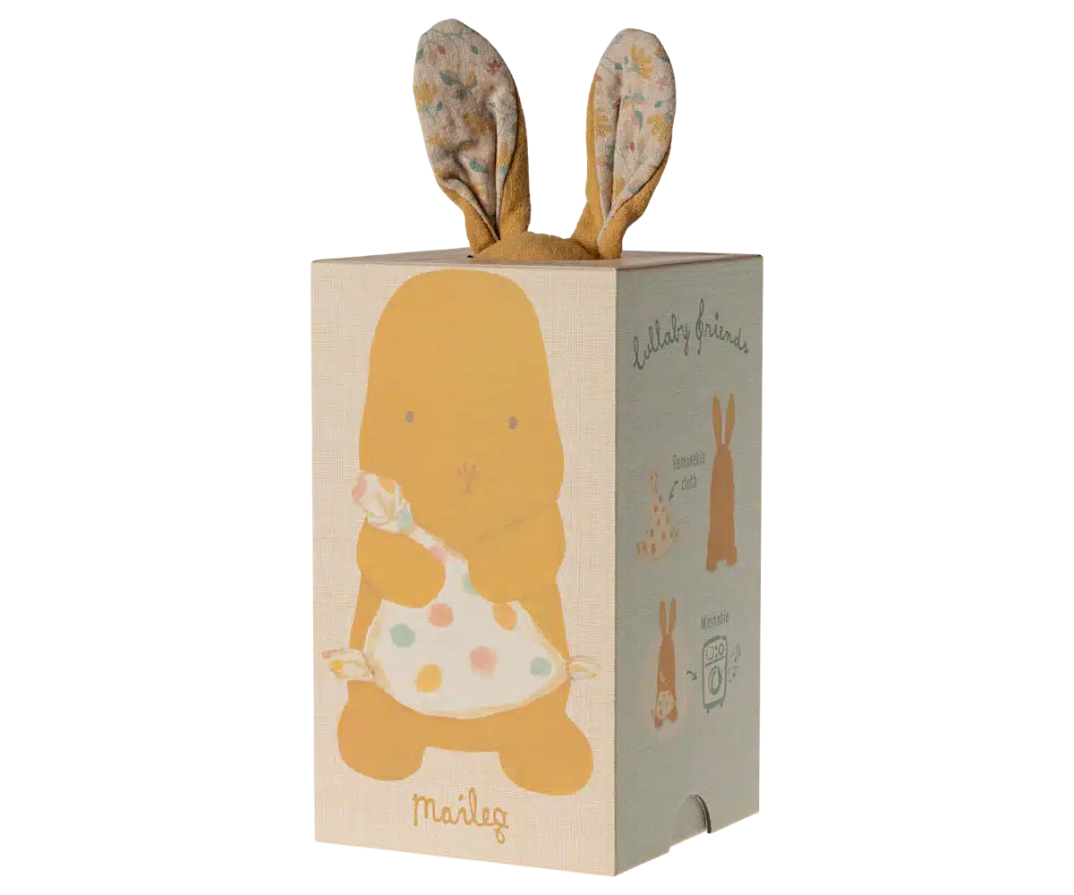 Lullaby Friends är en förtrollande kollektion skapad för att ge bebisar och små barn trygghet, ro och kärlek. Denna bedårande kanin i mjuka, gula toner har en gosig filt framtill och spelar Mozarts klassiska vaggvisa när du drar i svansen – perfekt för att skapa en lugn och trygg sovstund.