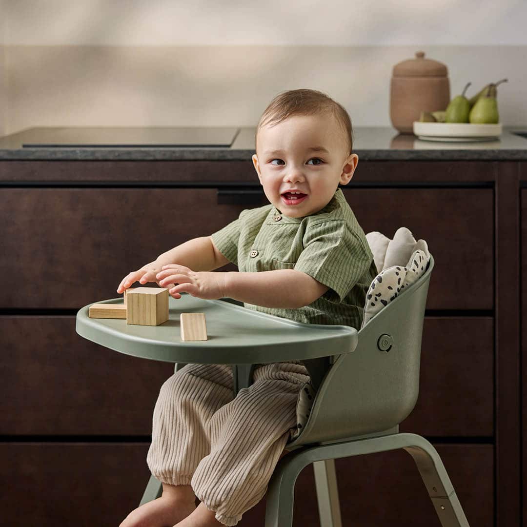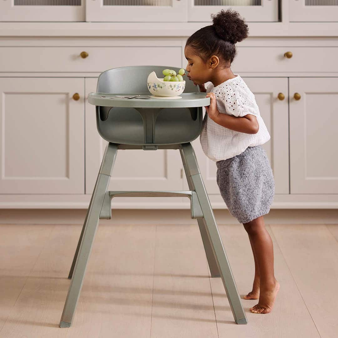 Tack vare sin smarta design, där brickan och bygeln är separata komponenter, kan stolen användas direkt intill matbordet. Det skapar en känsla av samhörighet – med hela familjen samlad i samma höjd.
