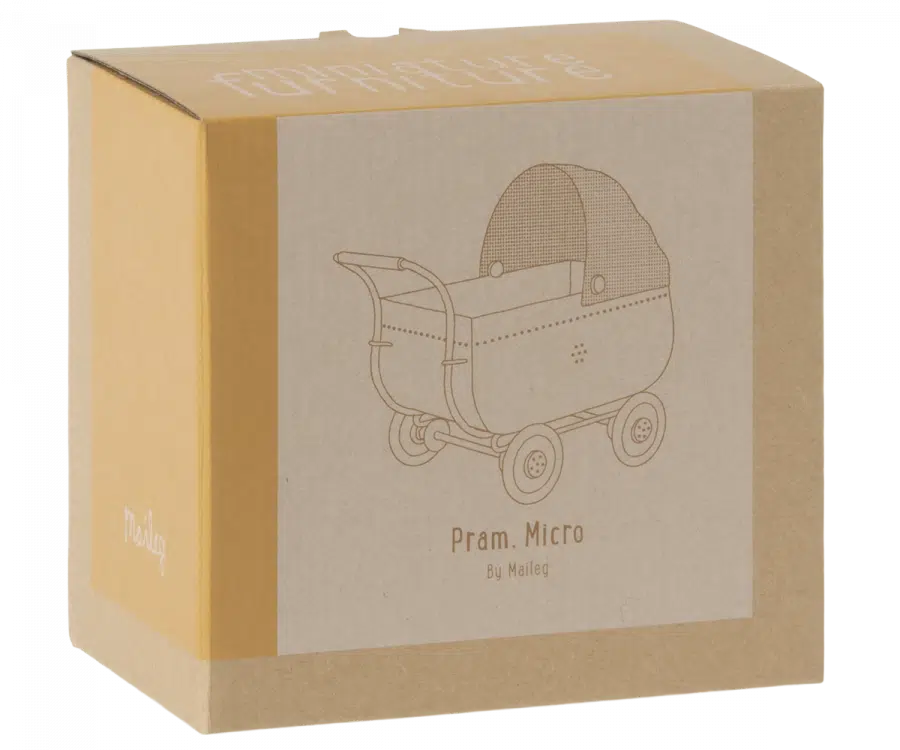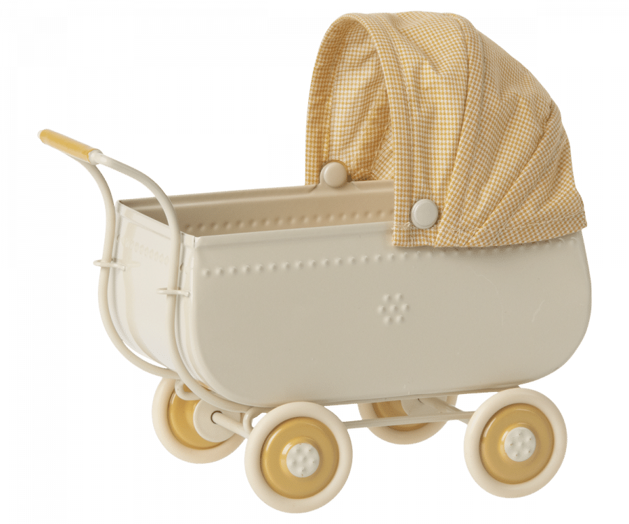 A beautiful Maileg pram with an exclusive vintage look. The metal part has embossed details on the sides, and the fabric cover fulfills the look. The pram is perfect for a walk when the baby sleeps.