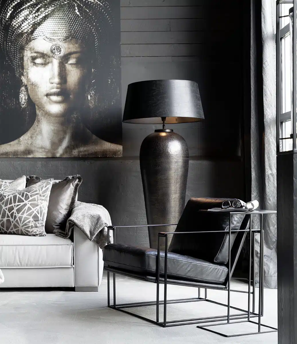 Lampfoten är gjord i metall och har ett diskret mönster i sig.
