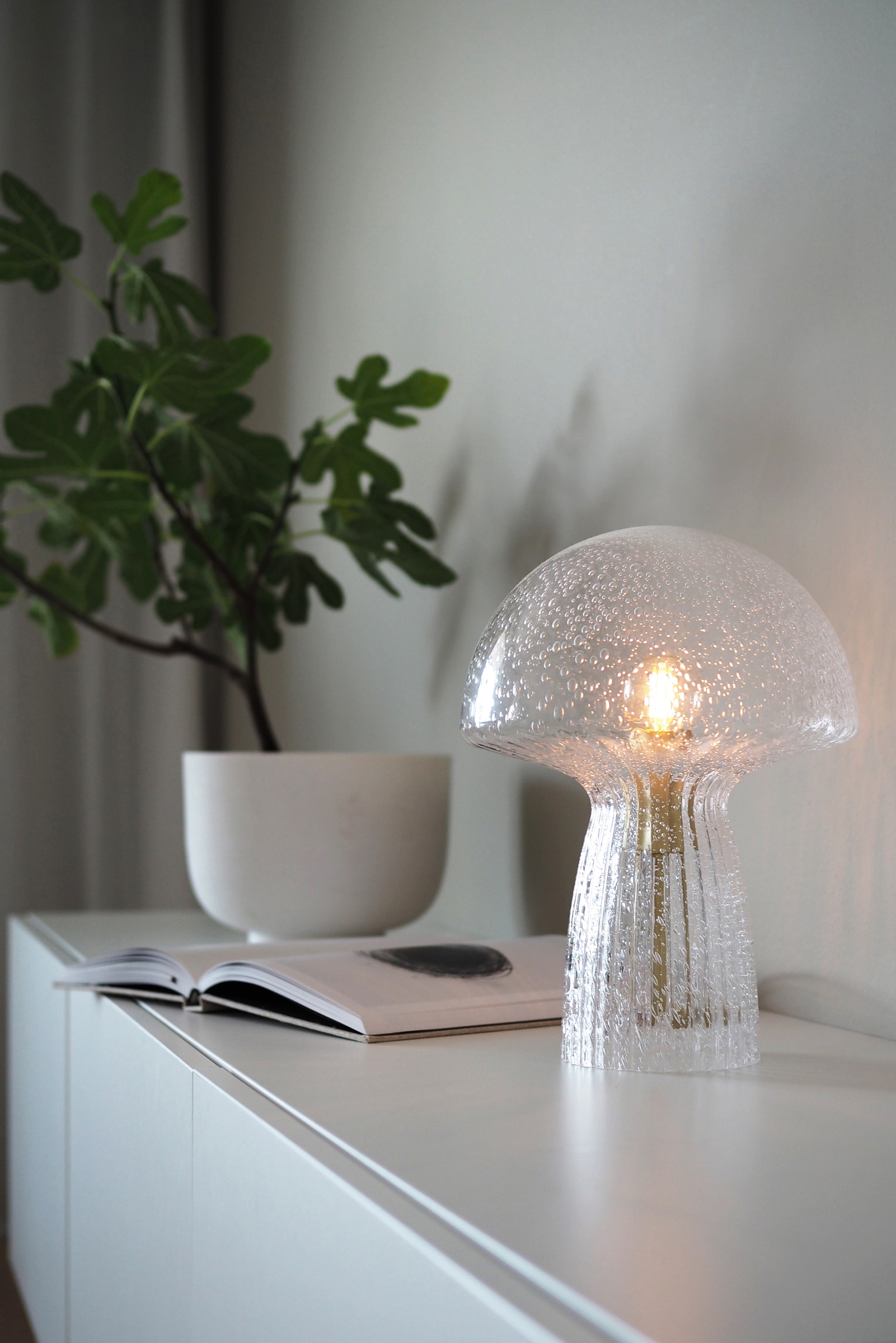 Med inspiration från nordisk natur kommer Fungo Special Edition 22, en unik bordslampa från Globen Lighting i svampformad design. Tillverkad i klarglas med räfflade detaljer, fångar den ljuset på ett subtilt och dekorativt sätt. Räfflorna sträcker sig hela vägen upp under ”hatten” och påminner om lamellerna på en skivlingsvamp.