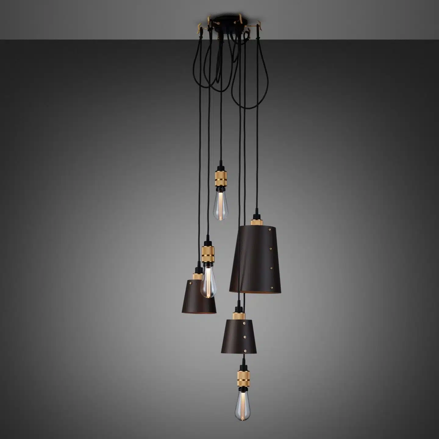 En ljuskrona som består av sex ljushängen i mässing, var och en med sin egen anpassade krok och matt gummidetaljer.
