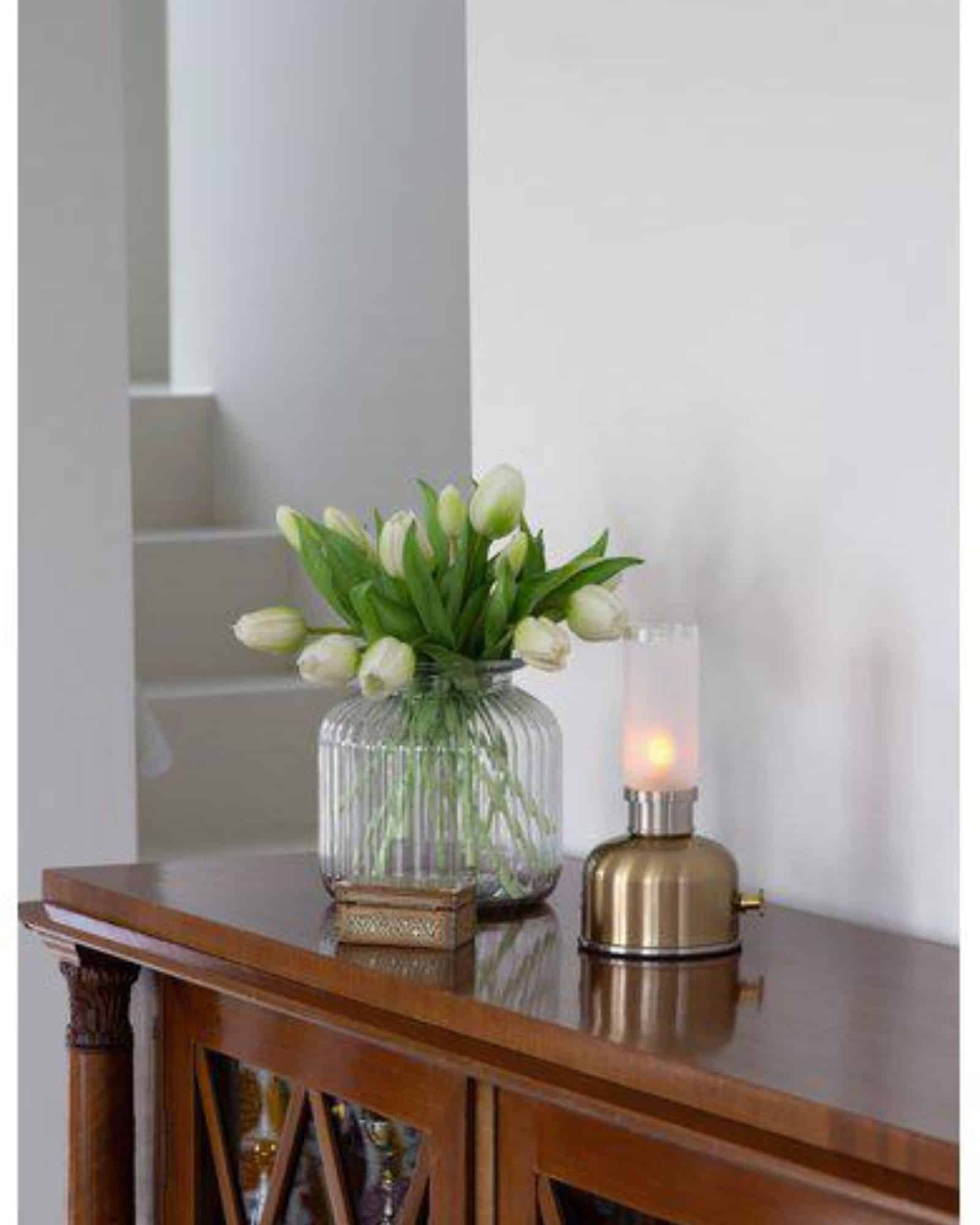 Frida portabel bordslampa är en elegant och praktisk lampa som för tankarna till klassiska oljelampor. Den stilrena designen i guld gör den till en dekorativ detalj i alla typer av hem.