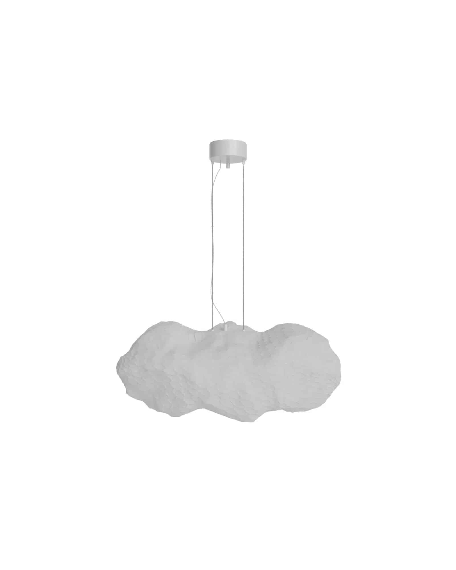 Nuevo taklampa vit 76 cm är en modern och luftig pendellampa som förenar konstnärlig form med funktionell belysning. Lampans unika silhuett är inspirerad av ett svävande moln, skapad av ett nätskikt i plastgjutharts som ger en lätt och textilliknande känsla.