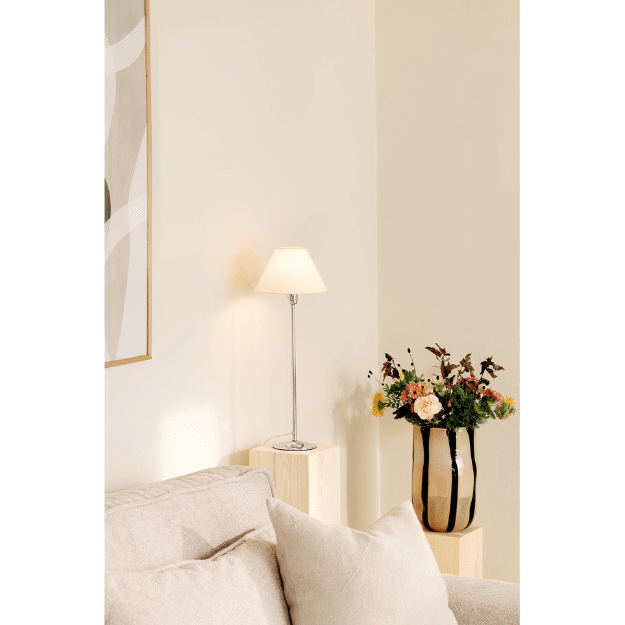 Iris vackra textilskärm är tillverkad för hand av bomull. Skärmen har ett topplock i matchande textil och på insidan av skärmen finns ett vitt bländskydd gjort av plast. Skärmen har ett E14-klofäste som fästes runt en ljuskälla.