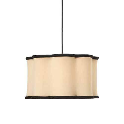 Med E27-gimble kan Judy användas som pendelskärm eller på en bordslampa, vilket gör den både praktisk och stilfull. Den vågiga designen skapar en harmonisk kontrast mellan det naturfärgade tyget och den svarta kanten.