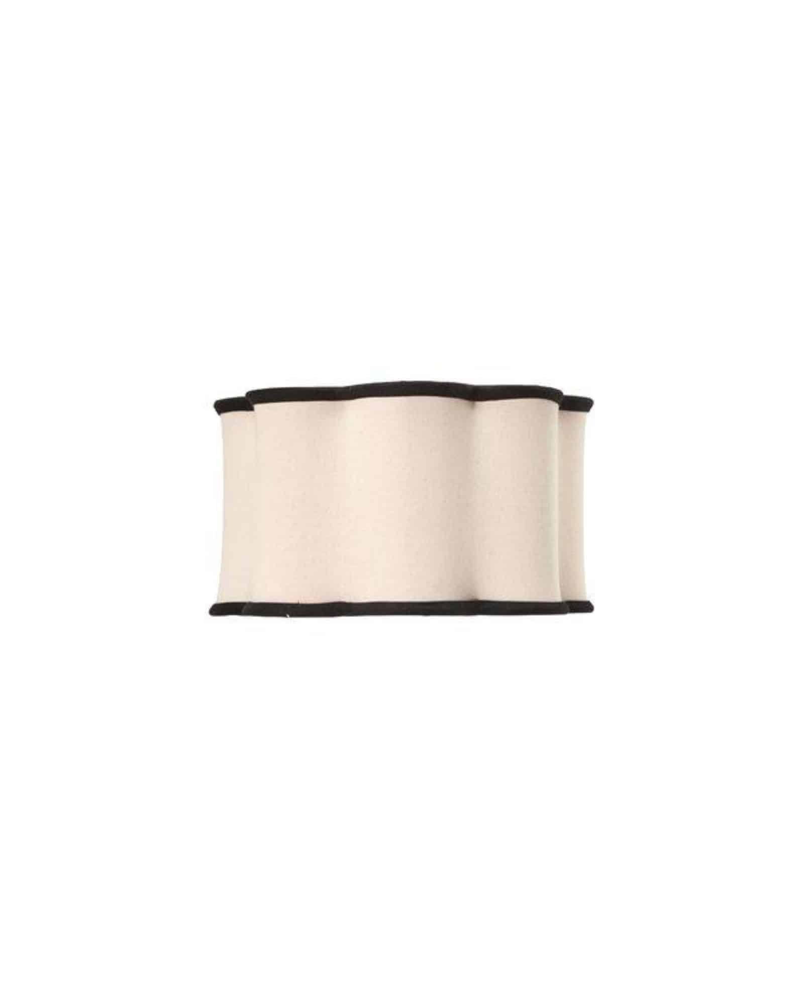 Judy är en elegant och vågig lampskärm tillverkad i ekologisk oblekt bomull. Den svarta kanten framhäver skärmens unika form och gör den till ett dekorativt blickfång i hemmet. Lampskärmen är helfodrad i samma tyg och sprider ett mjukt och behagligt ljus, perfekt för både vardagsrum och sovrum.
