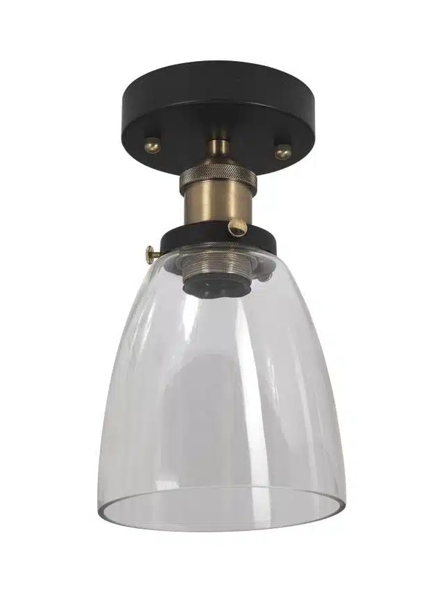Taklampa i klassisk design med klarglas och metallchassi i mattsvart/mässing ytfinish. Den är fuktskyddad i IP23 klassning och passar bra i badrumsmiljöer. Eftersom glasskärmen är handgjord kan det förekomma enstaka luftbubblor i glaset samt en viss ojämnhet i glastjocklek över glasytan.