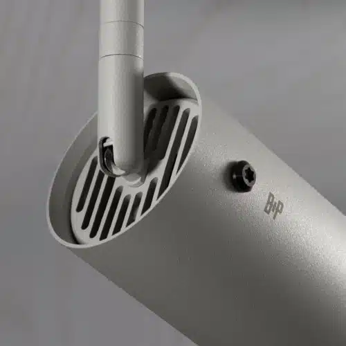 Strålkastaren har vår signatur linjära räfflade baffel och maskinbearbetade torx-skruvar, båda tillverkade av solidt rostfritt stål med en pistolmetall PVD-finish. Baffeln fångar ljus och skapar ett delikat metalliskt sken, medan ett bikakefilter avger en exakt, bländfri, riktad strålkastare.