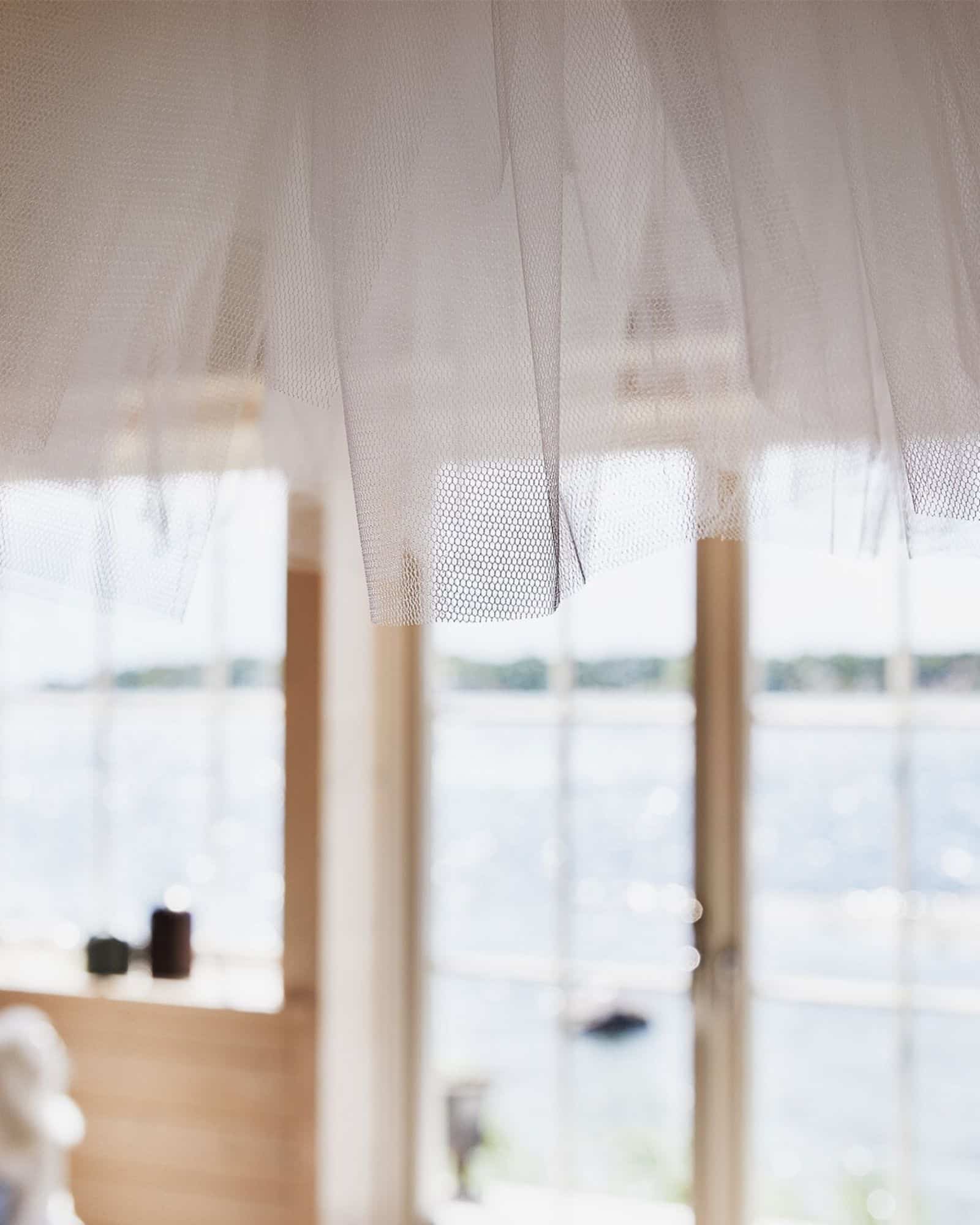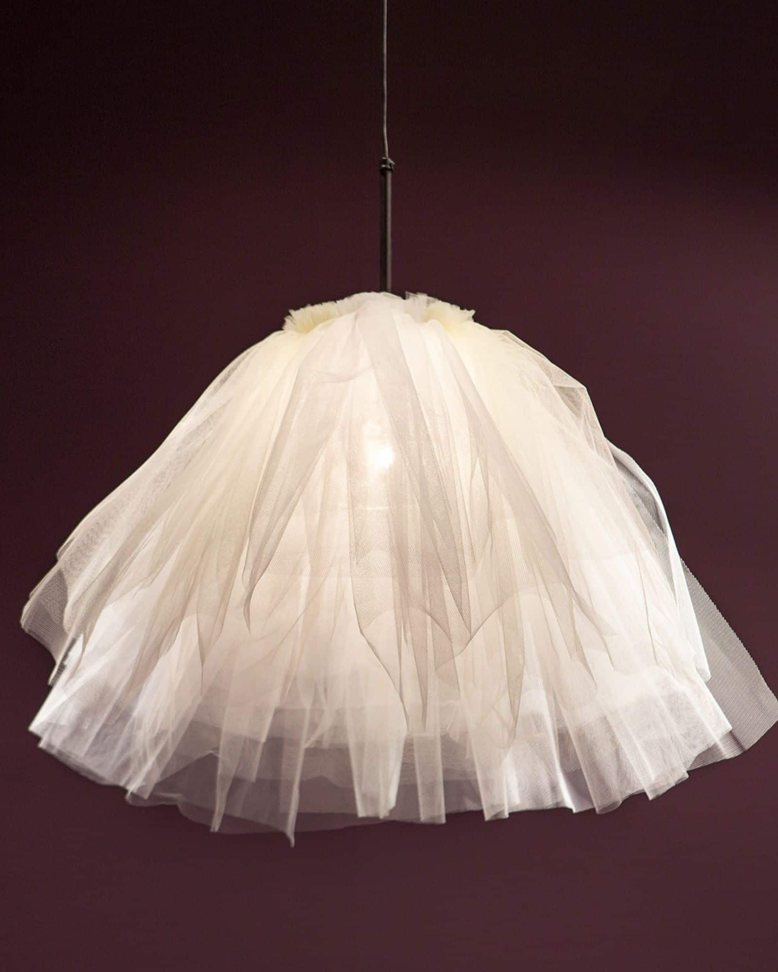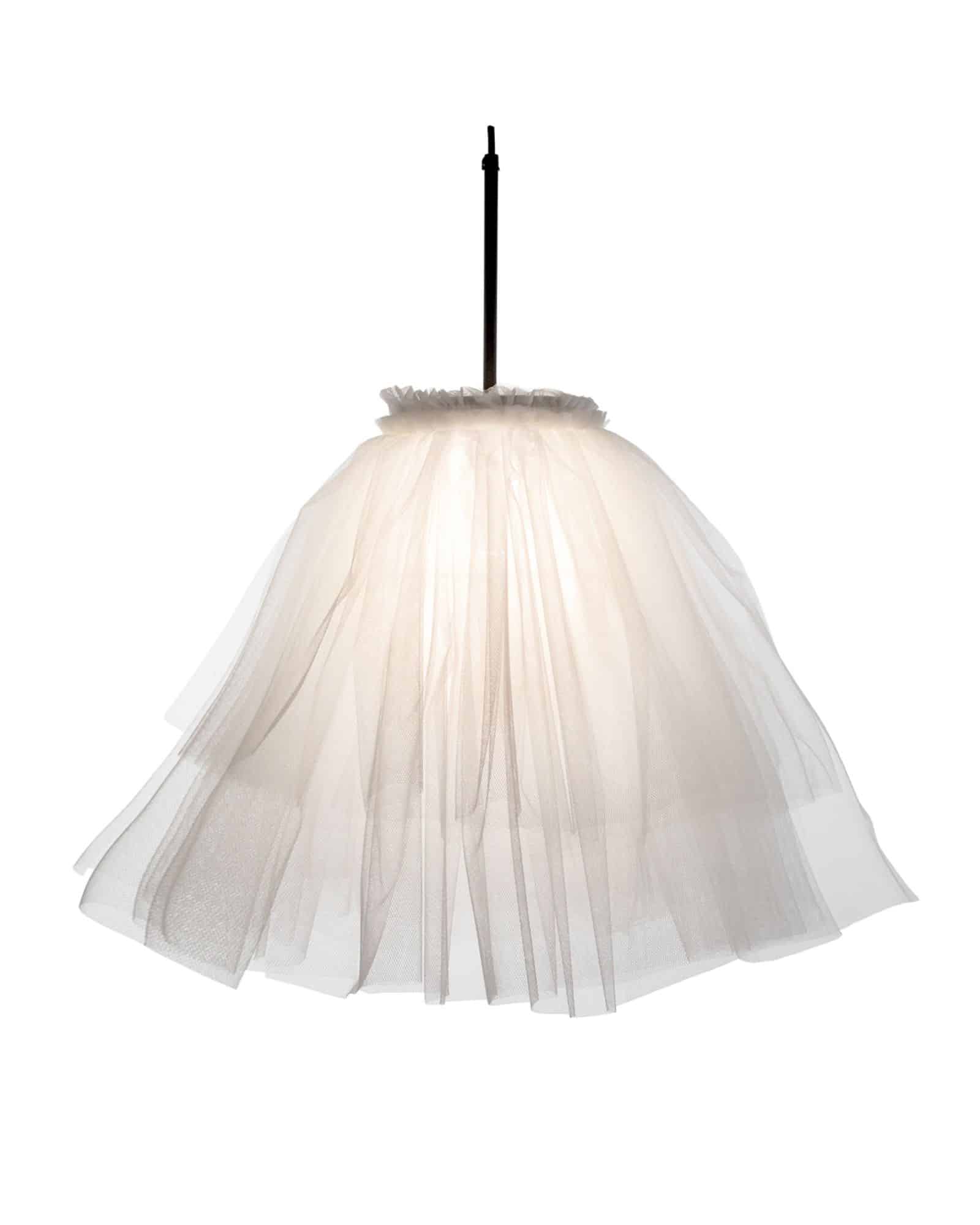 Tyllskärmen ger lampan en luftig och textil känsla som passar perfekt över matbordet, i hallen eller som en mjuk kontrast i moderna miljöer. Den drar blickarna till sig utan att dominera, och lyfter rummets karaktär med sin enkla men uttrycksfulla design.