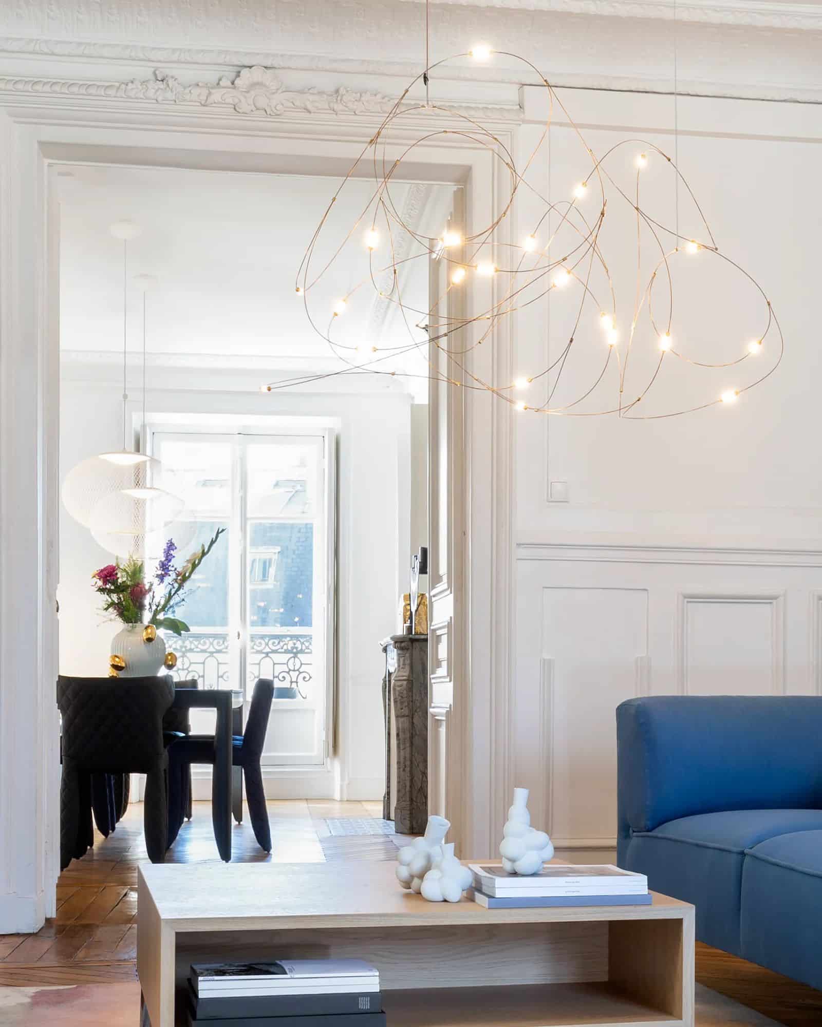 Takkronan Flock Of Light 21 är formgiven av de holländska formgivarna Studio Toer för Moooi. Armaturen har ett unikt utseende som gör att den kan gå från en lätt och luftig design på dagen till en mer dramatisk lampa när mörkret faller sig på. Flock Of Light 21 består som namnet antyder av 21 ljuskällor som placerats på tunna bronstrådar. Lampan är tillverkad av mässingskoppar, bronstrådar och semi-transparanta polykarbonat. Materialen ger Flock Of Light 21 ett unikt utseende som ser olika ut beroende på vilken vinkel av armaturen man ser.