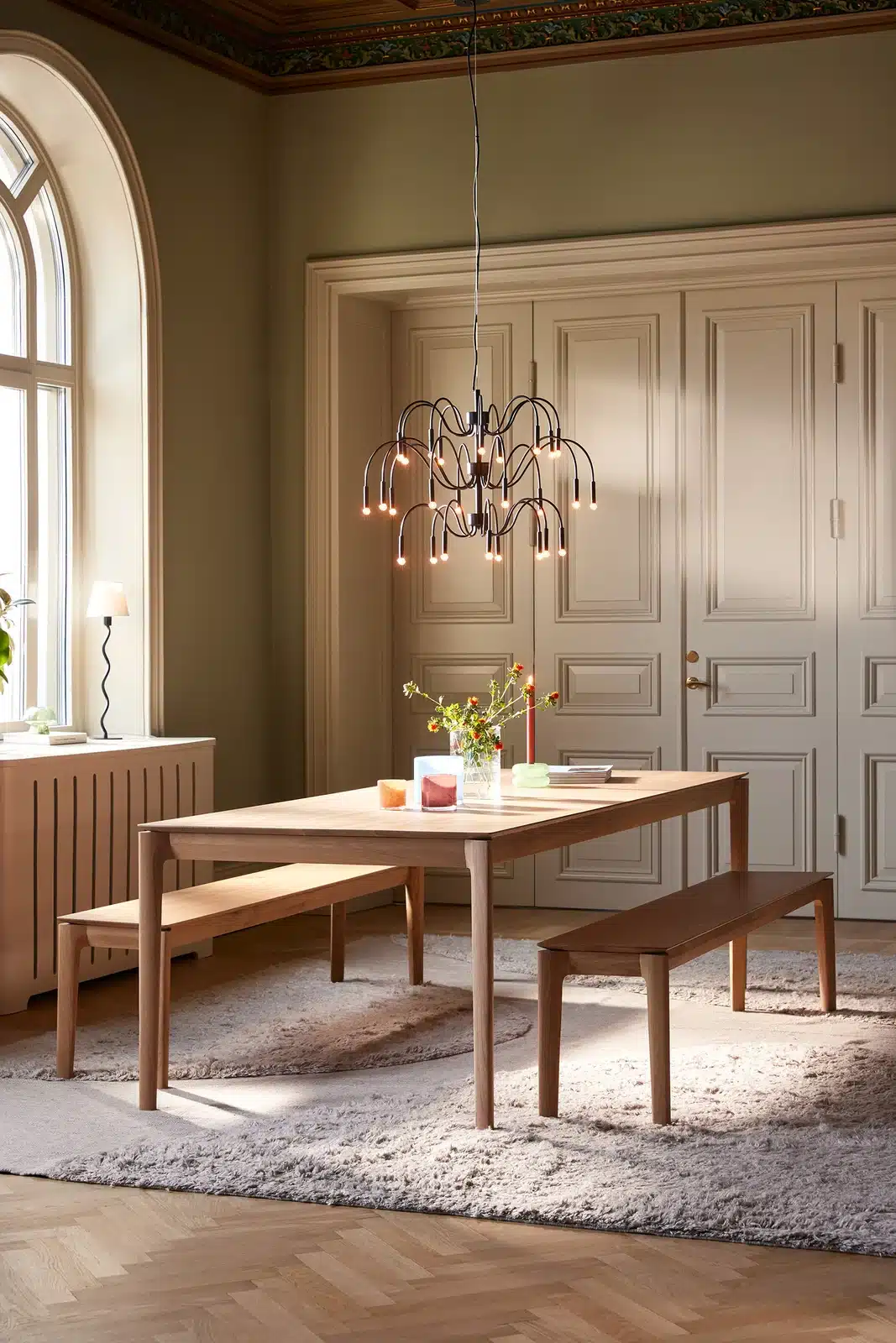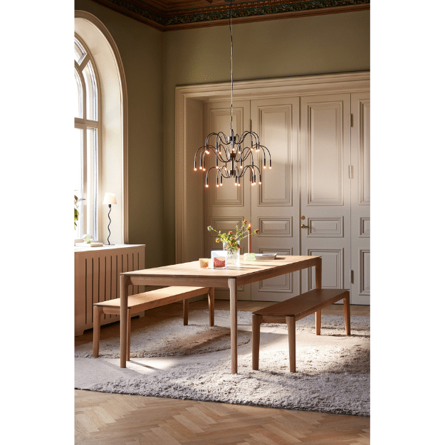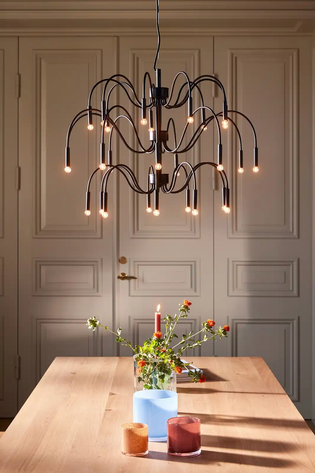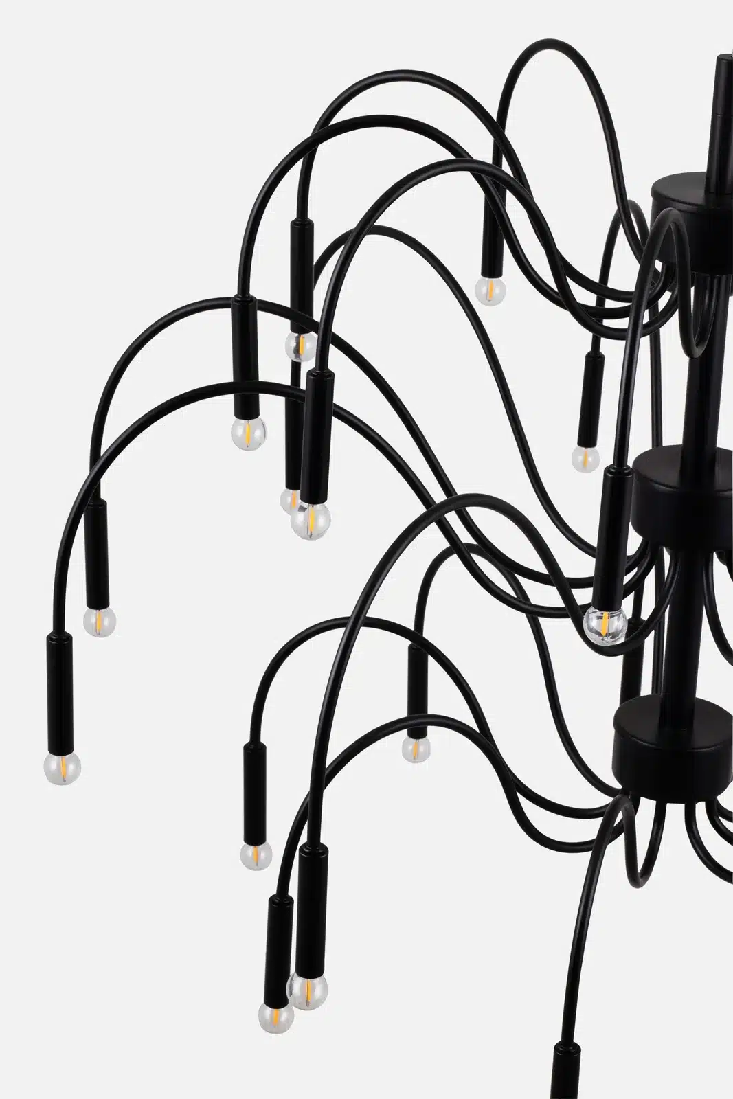 Ben är en samtida tolkning av en klassisk takkrona, som med sina 27 vackert böljande armar blir mittpunkten i rummet. Lampan är tillverkad av mattlackerad svart metall, har en 300 cm lång svart textilkabel med vajer samt matchande takkopp gjord av metall, kronkoppling för takanslutning och ljuskällor medföljer ej. Notera att både armaturen och de rekommenderade ljuskällorna inte är dimmerkompatibla.