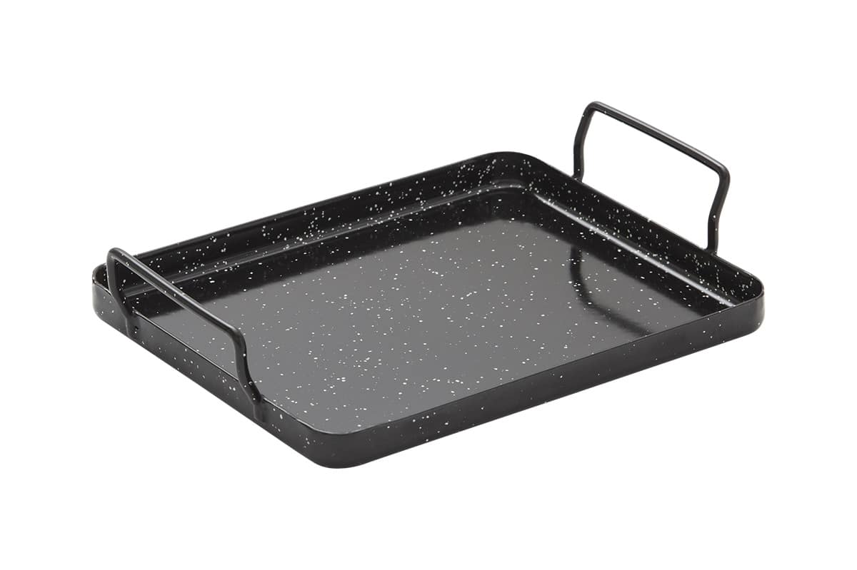 Emaljerade stekbleck med handtag, perfekta att använda i ugnen eller på grillen. Storlek: 26×30 cm. Tål maskindisk. Tillverkade i Spanien.