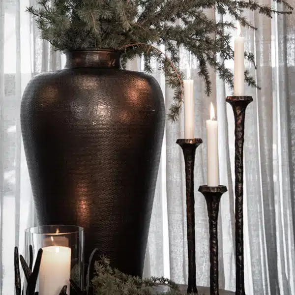 Urna av metall med hammrad yta. Erbjuder ett inbjudande utseende som passar perfekt i både minimalistisk och industriell inredning. Använd urnan som en elegant inredningsdetalj eller som en tidlös vas för dina favoritgrenar. Observera att urnan endast ska användas inomhus och inte för direkt plantering. Den är idealisk för torkade dekorationer eller blommor, vilket gör den till ett mångsidigt tillskott till ditt hem.