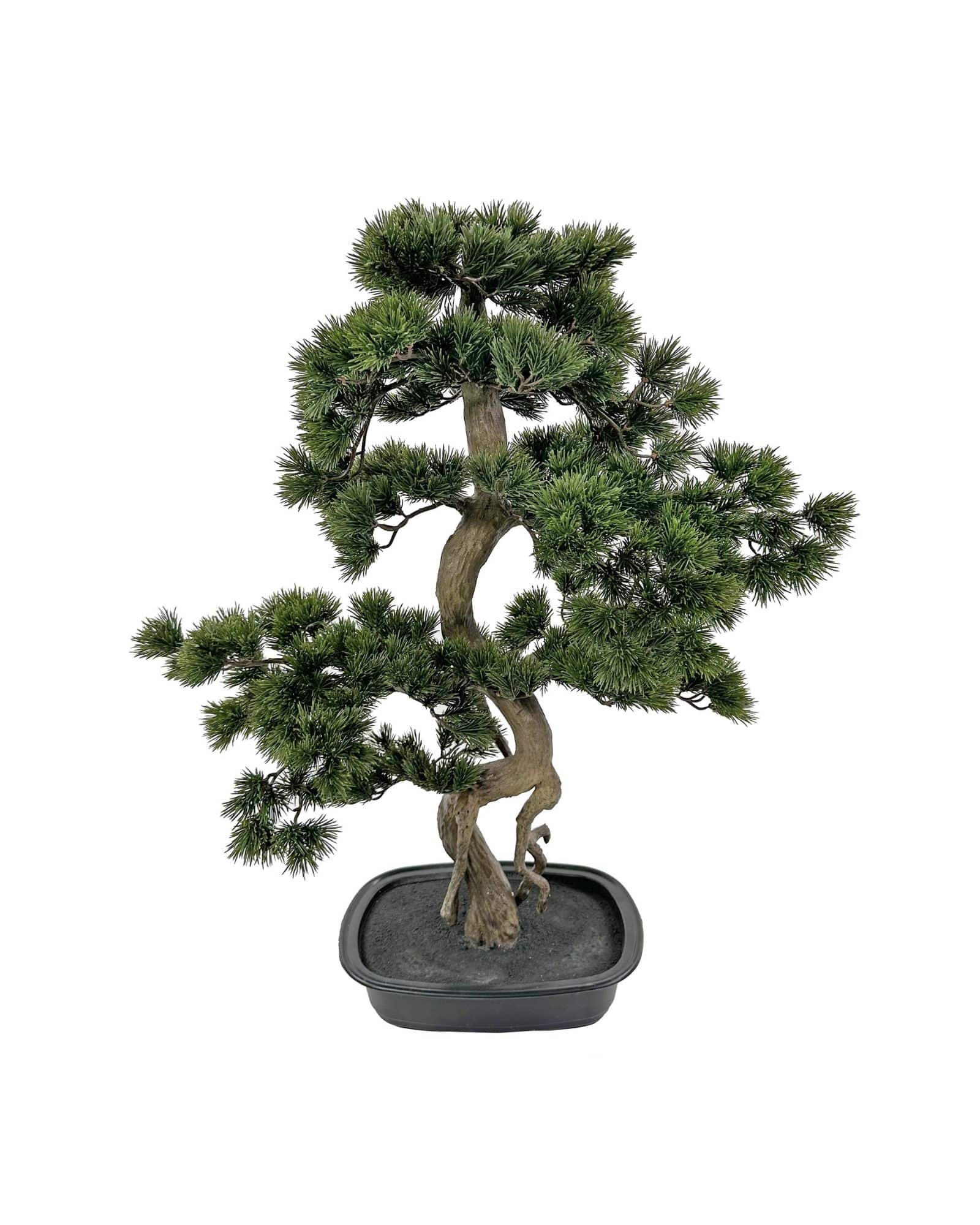 Bonsaiträdet är naturtroget utformat med välbalanserade grenar, fylliga gröna barr och en detaljerad stam som ger ett realistiskt och harmoniskt intryck. Den eleganta svarta krukan förstärker helheten och skapar en modern kontrast. Som gör att växten smälter in i både minimalistiska och mer klassiska inredningsmiljöer.