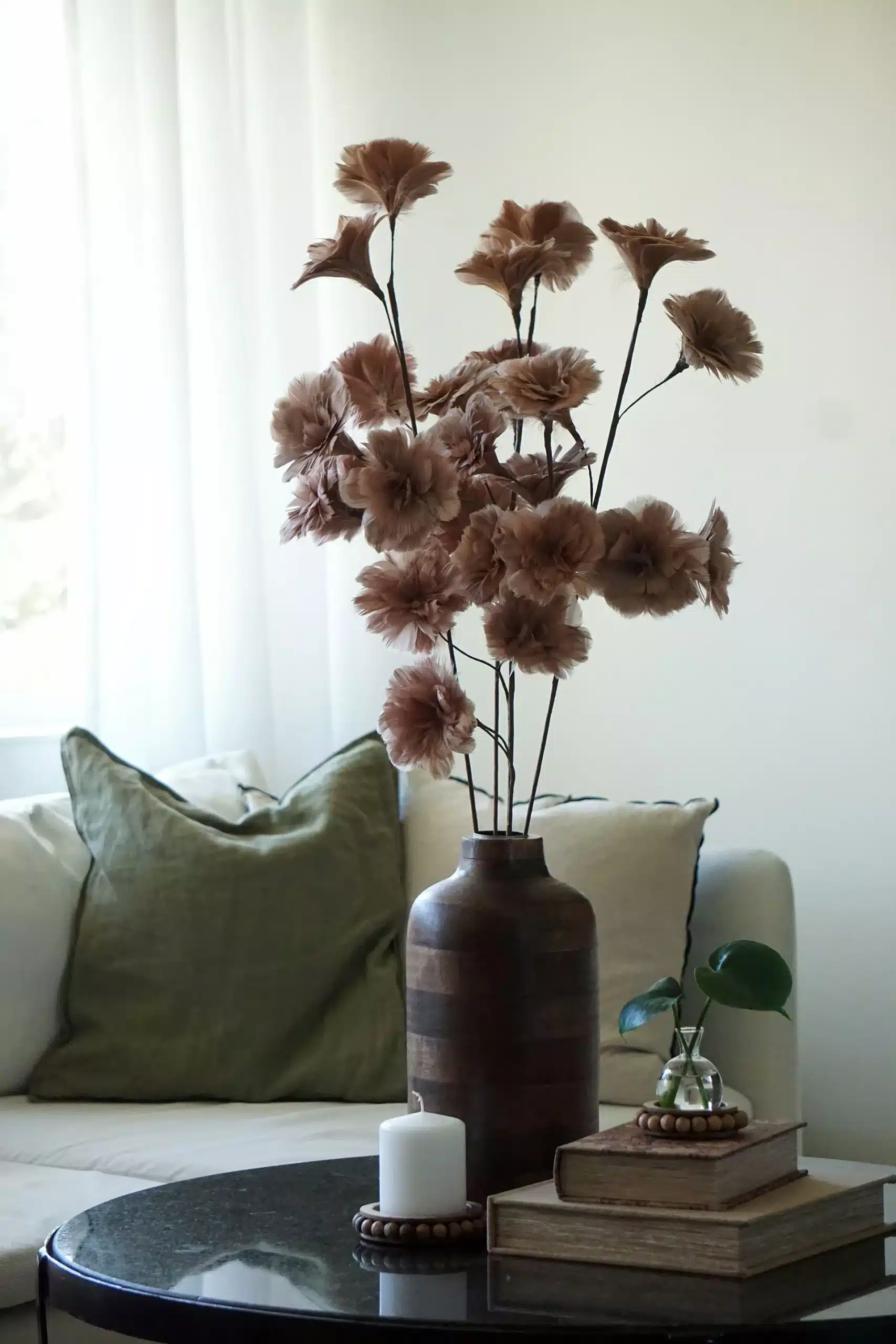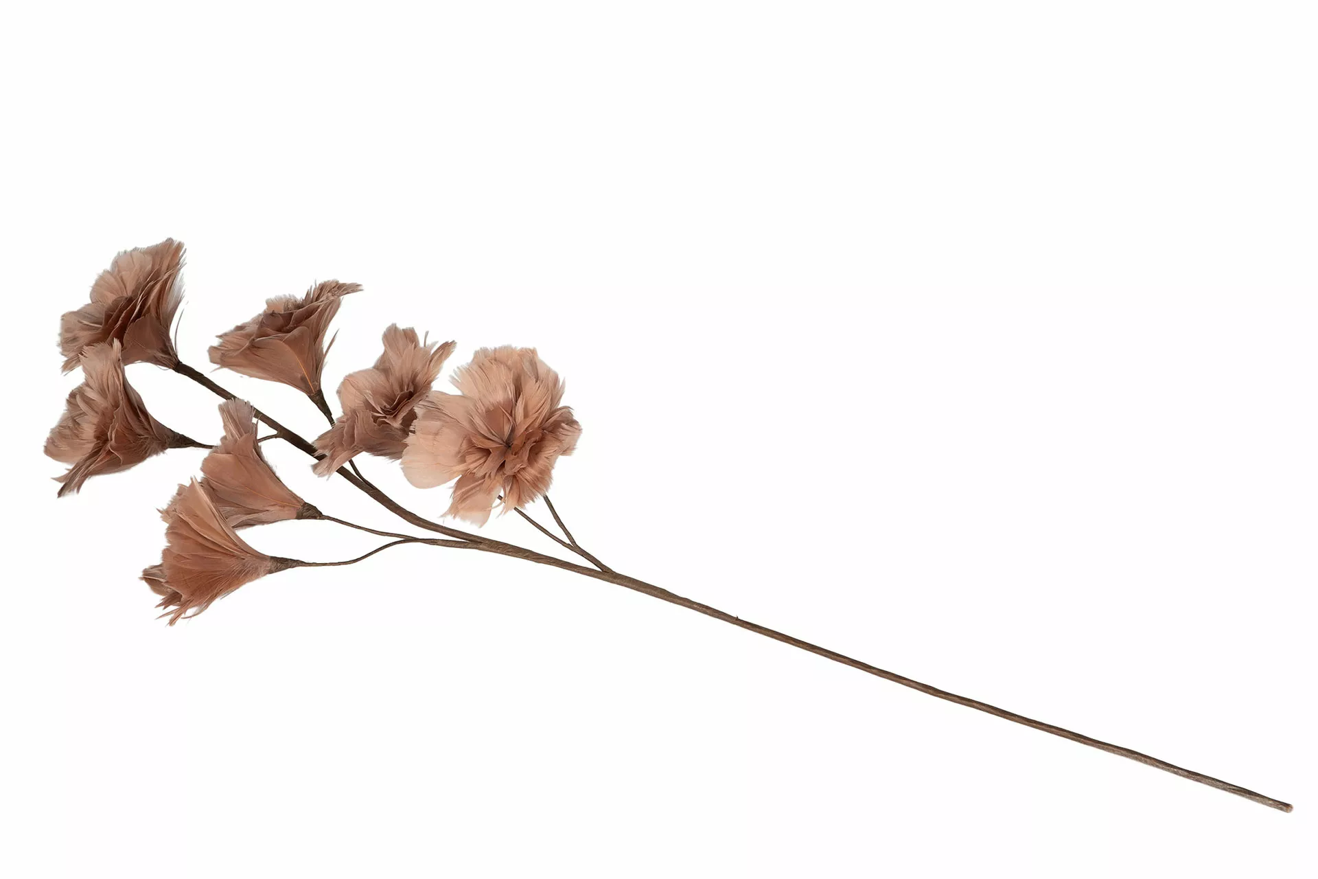 Fjäderblommorna på kvisten skapar ett mjukt och lätt uttryck som skiljer sig från vanliga konstblommor. Den bruna mullvadstonen ger en varm och jordnära känsla, vilket gör kvisten till ett utmärkt val för dig som vill ha en naturnära och harmonisk inredning. Tack vare sin neutrala färg passar den både ensam i en smal vas eller tillsammans med andra kvistar och blommor i större arrangemang.