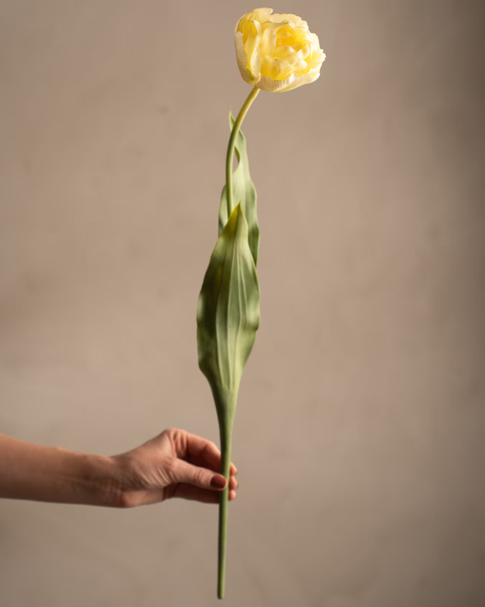 Blomman är inspirerad av den klassiska Tulipa och har en detaljrik design med mjuka kronblad och en naturtrogen stjälk. Tack vare den genomarbetade formen ser den både elegant och levande ut. Samtidigt gör den generösa längden på 67 cm att den passar perfekt i både höga och medelstora vaser.