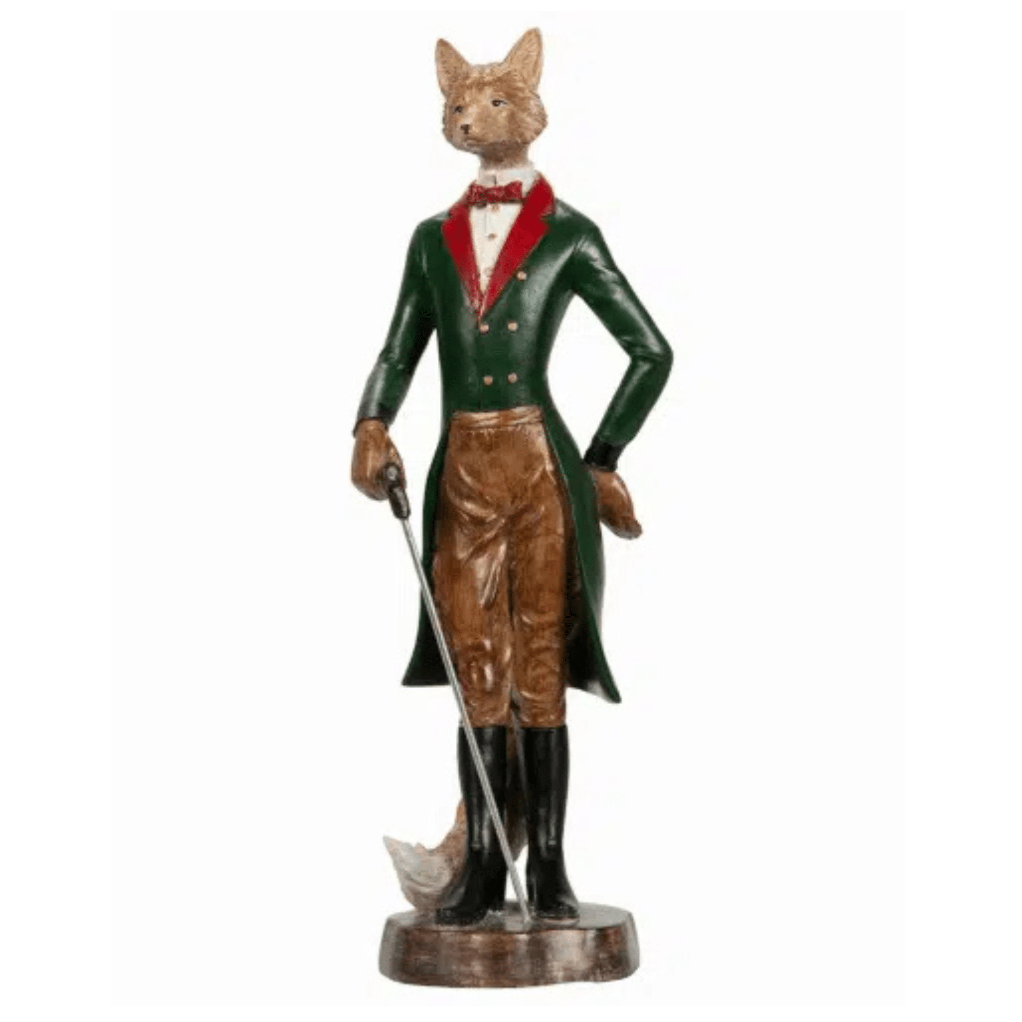 Rävens detaljer är noggrant utformade. Fracken, promenadkäppen och de harmoniska färgerna i svart och brun ger en känsla av både humor och elegans. Dekorationen fungerar också utmärkt som present till någon som uppskattar unika inredningsdetaljer.