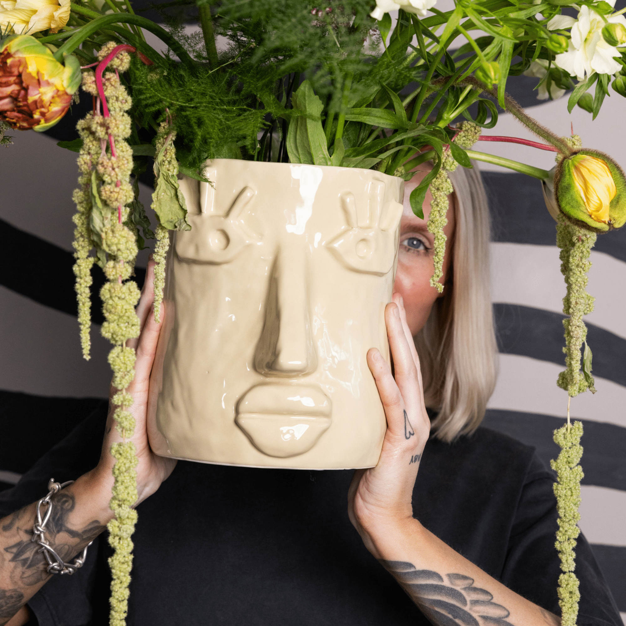 Facy är inte vilken kruka som helst, det är ett konstverk med personlighet. I samarbete med konstnären Emma Widell har Byon skapat en unik design som verkligen sticker ut. Formen är inspirerad av Emmas målningar, där det operfekta får vara vackert. Just därför har Facy fått ett ansikte med en tydlig näsa och organiska former. Resultatet? En kruka som känns både levande och konstnärlig.
