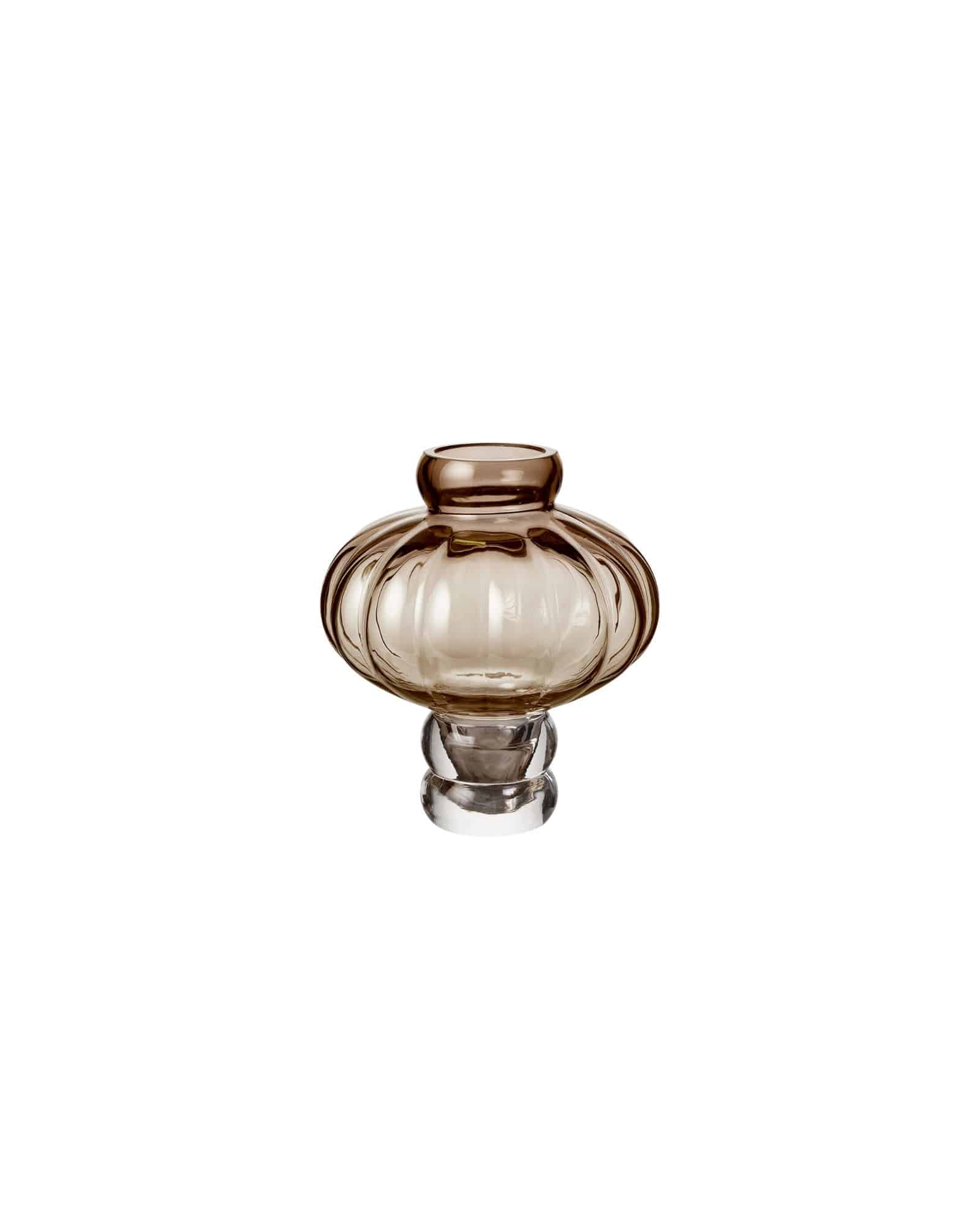 Balloon Vase 02 från Louise Roe är en handblåst glasvas i färgen smoke. Den skulpturala formen och ljusreflektionerna gör vasen till en elegant dekorativ detalj eller blomvas.