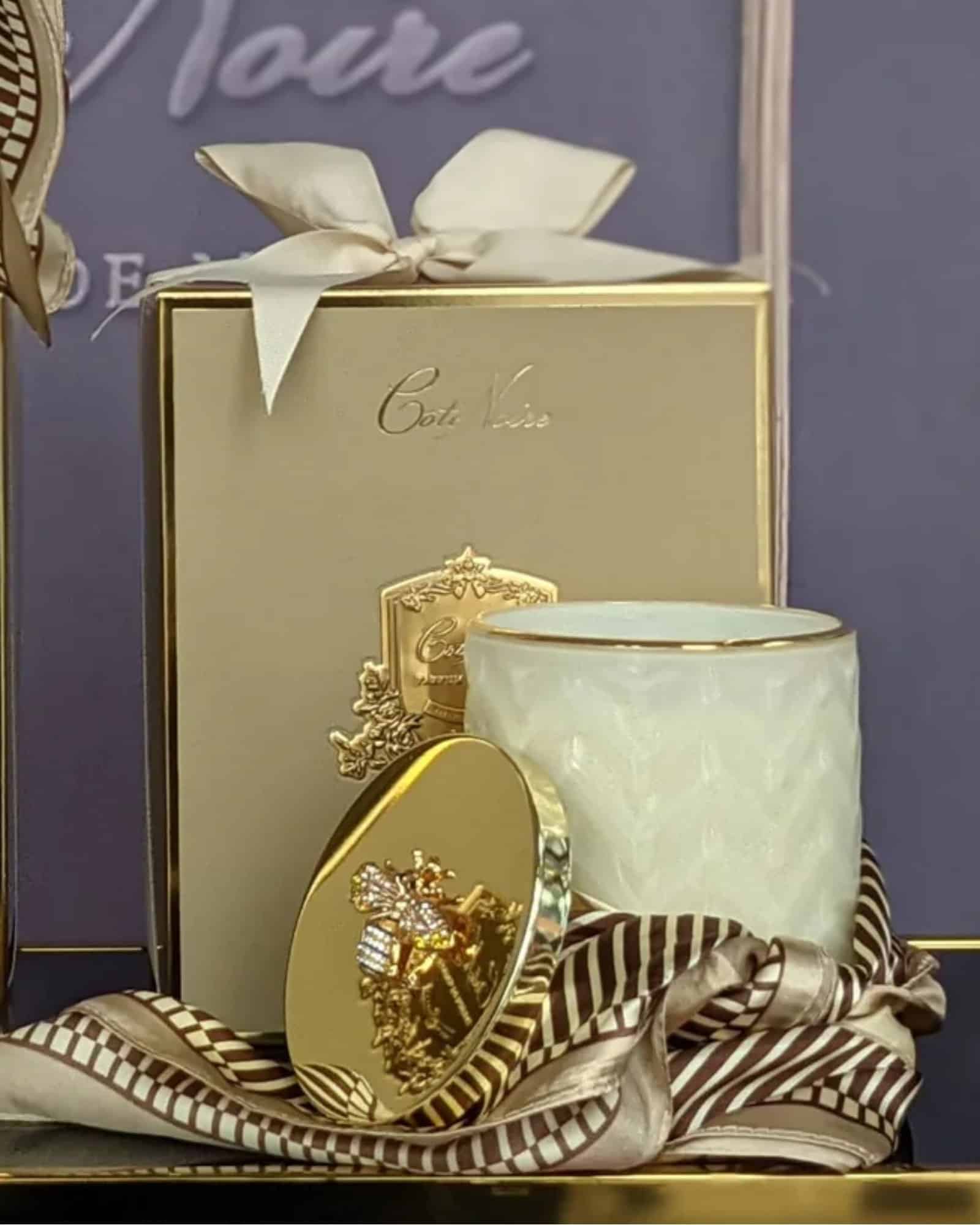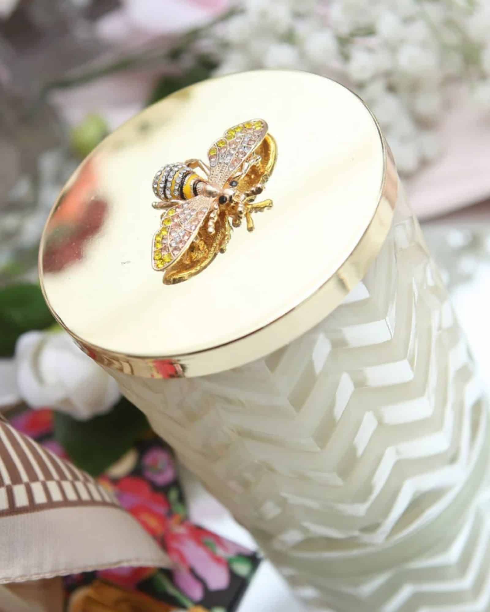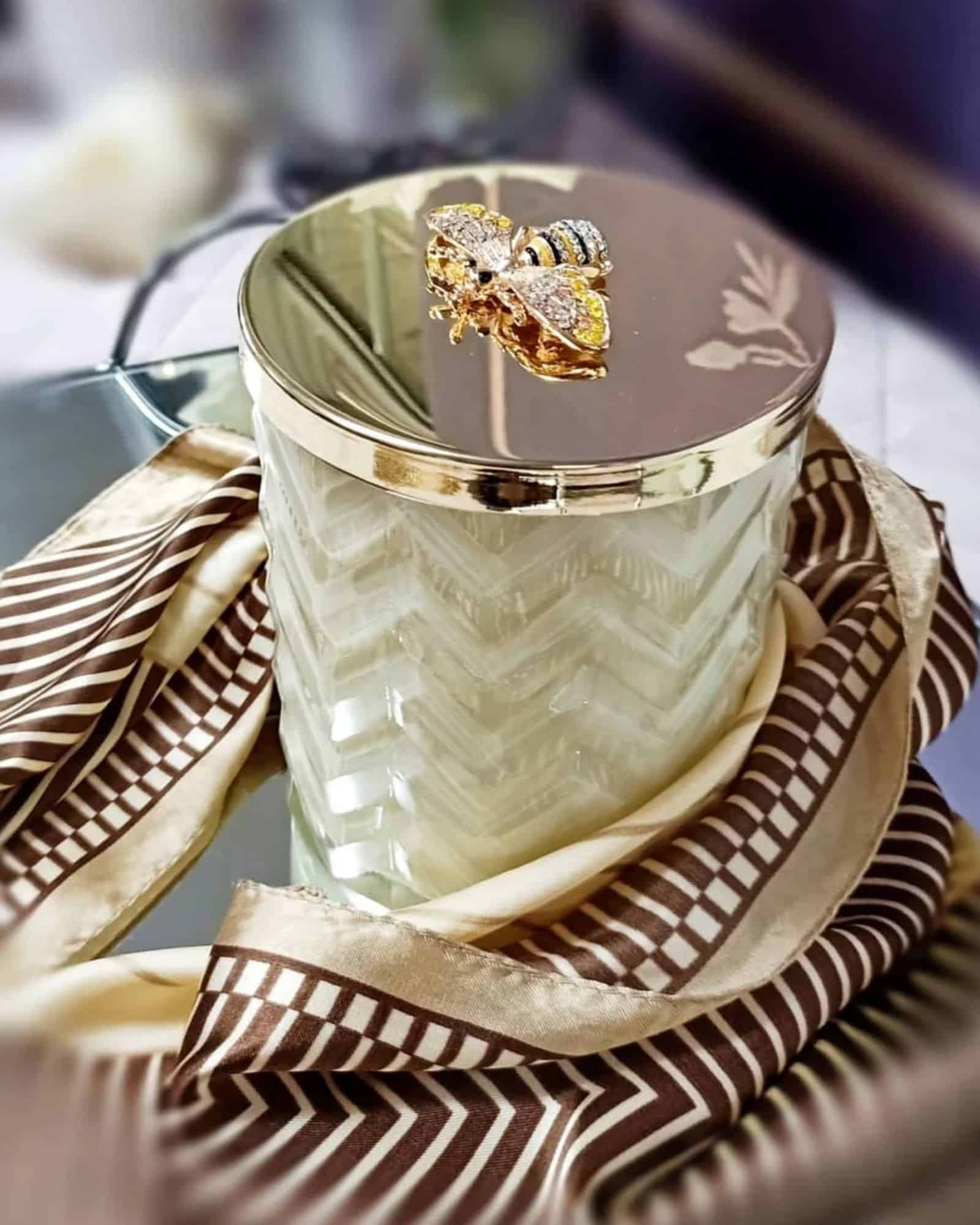 Ljuset kommer i en vackert mönstrad herringbone-glasbehållare med ett elegant guldfärgat lock prytt med en dekorativ bi, en lyxig presentask med rosett, samt en sidenliknande scarf – perfekt som en gåva till någon du tycker om (eller till dig själv).