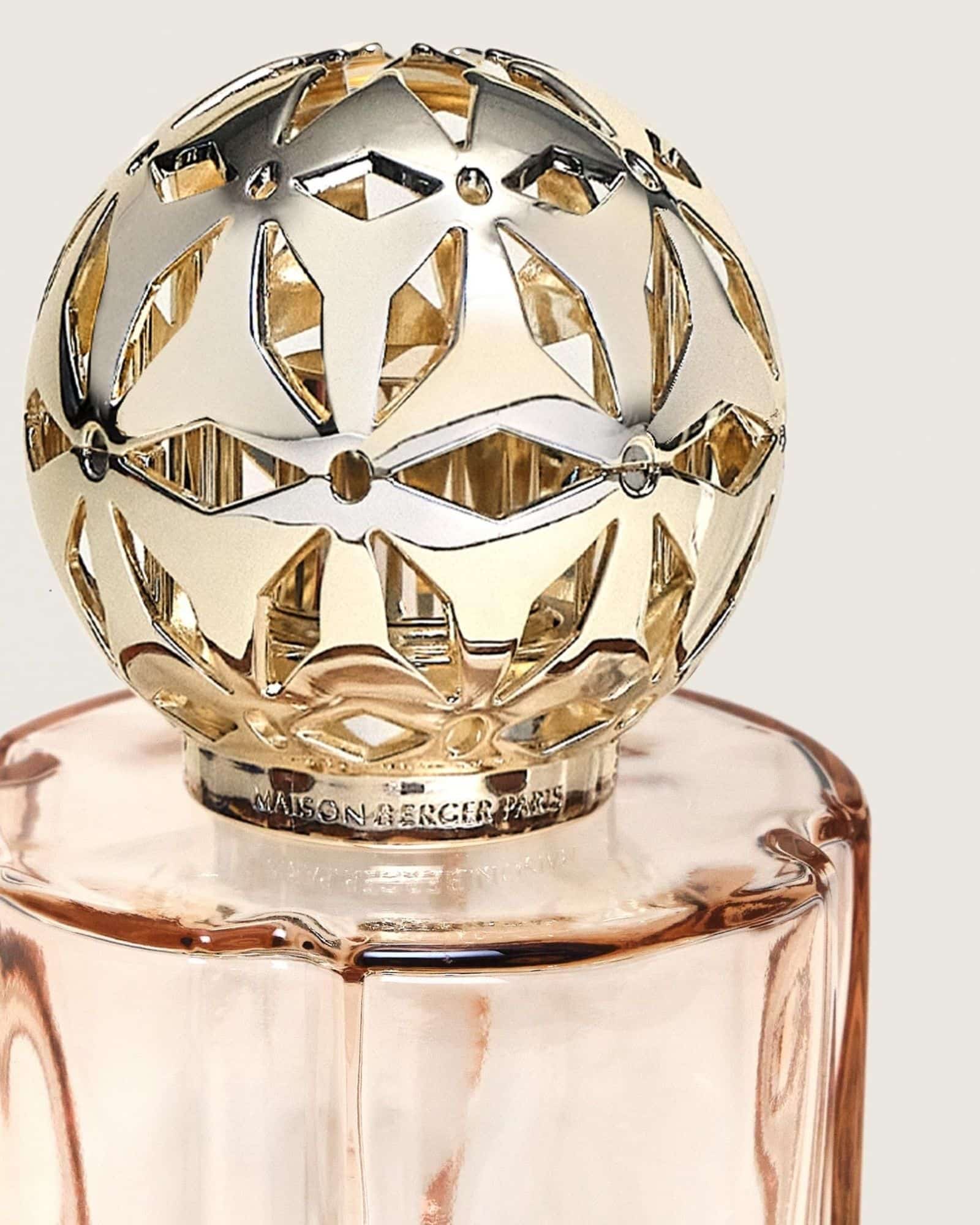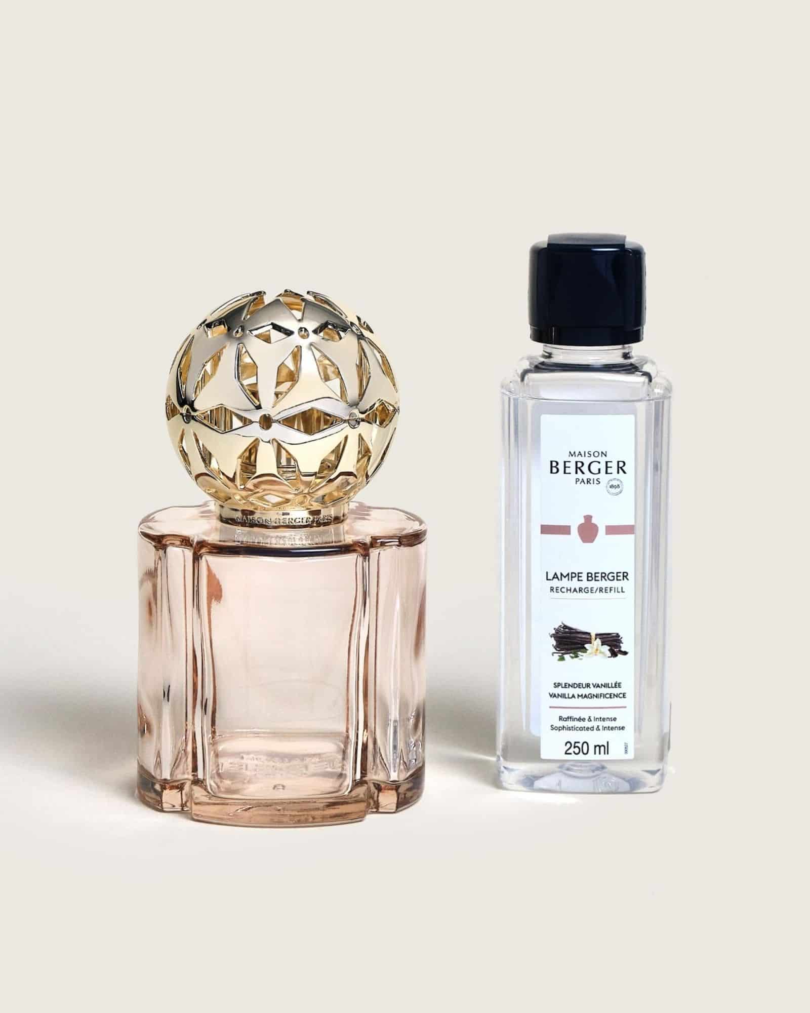 Maison Berger Pomelis Beige gåvoset Vanilla Magnificent kombinerar doft, design och funktion i ett elegant helhetsintryck. Lampan har en varm beige ton och en form inspirerad av pomander, små smyckesliknande behållare för väldoft. De mjuka linjerna och det guldfärgade gallret ger lampan en lyxig men lugn känsla.