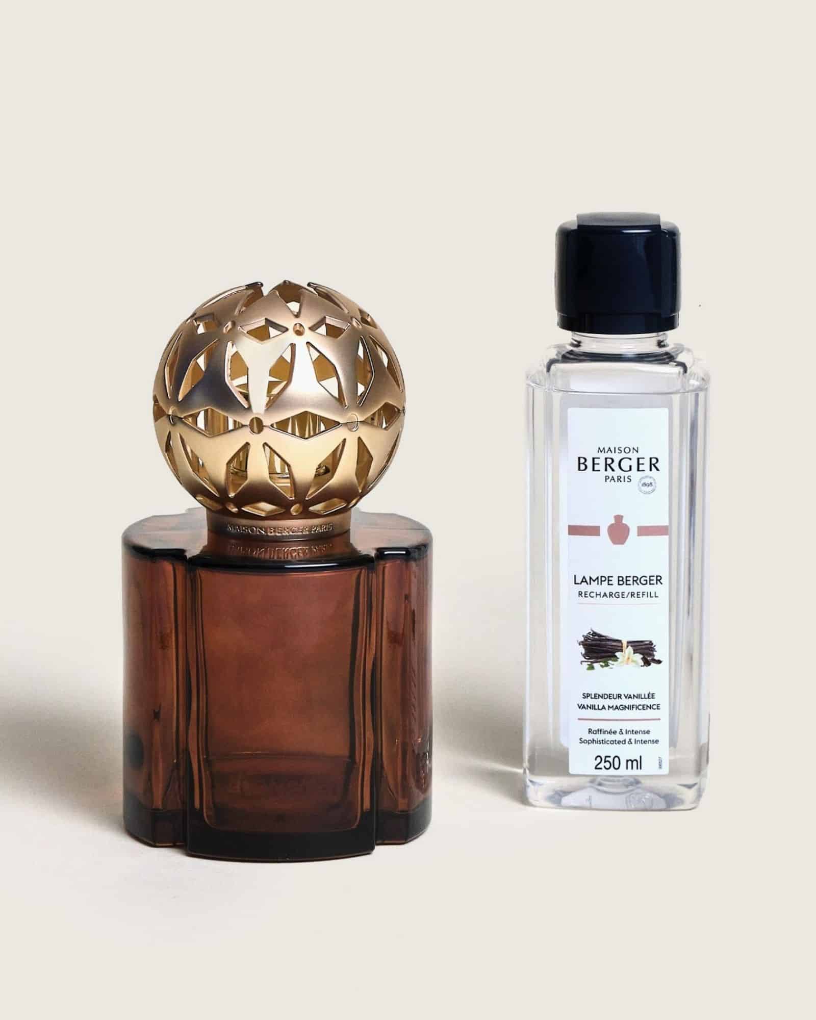 Maison Berger Pomelis Chocolat Gåvoset Vanilla Magnificent är en stilren doftlampa som kombinerar funktion med elegans. Den chokladbruna nyansen ger lampan ett djupare och varmare uttryck än den ljusare varianten. Den gyllene ramen, inspirerad av traditionella pomander, tillför en klassisk touch som lyfter helhetsintrycket.