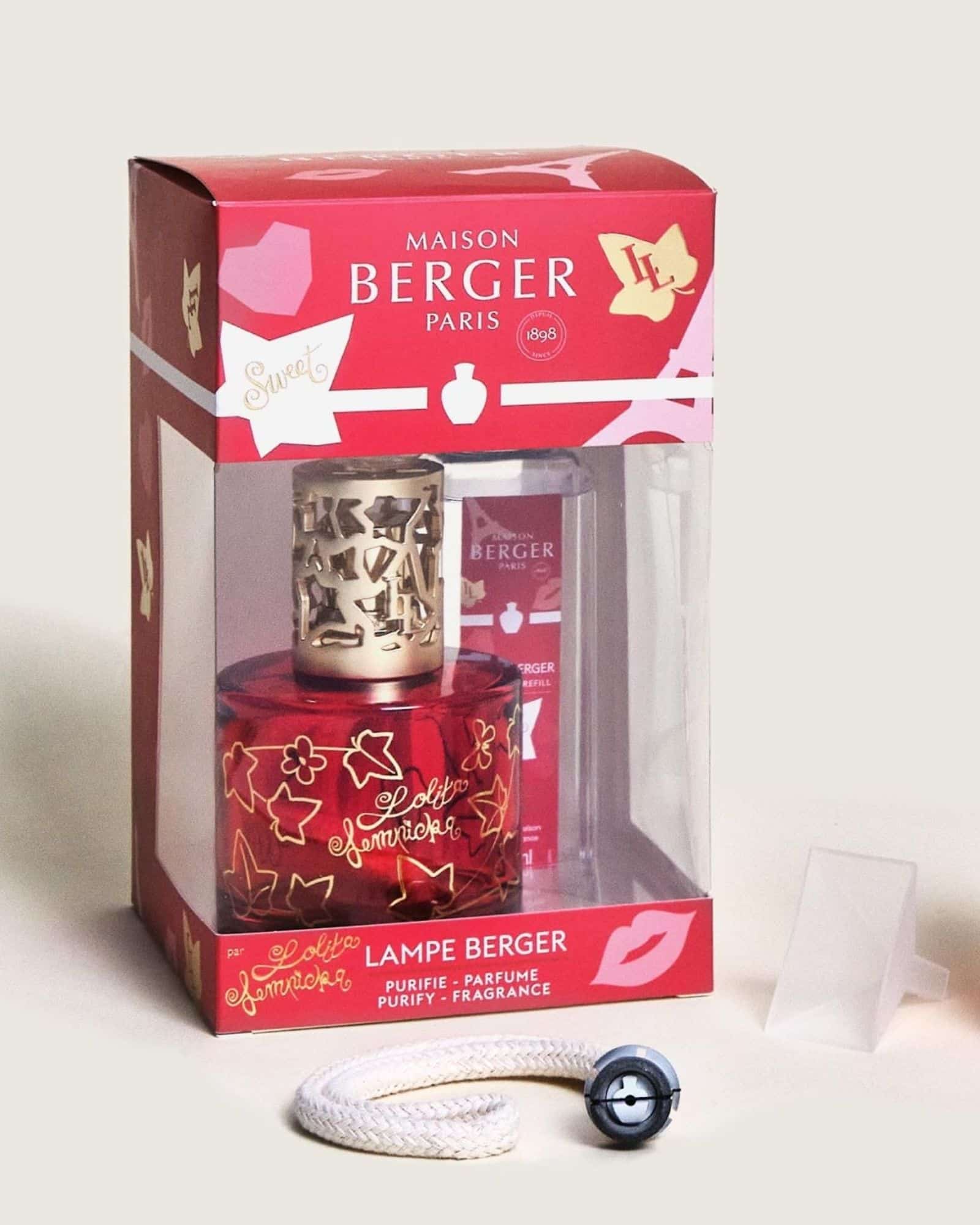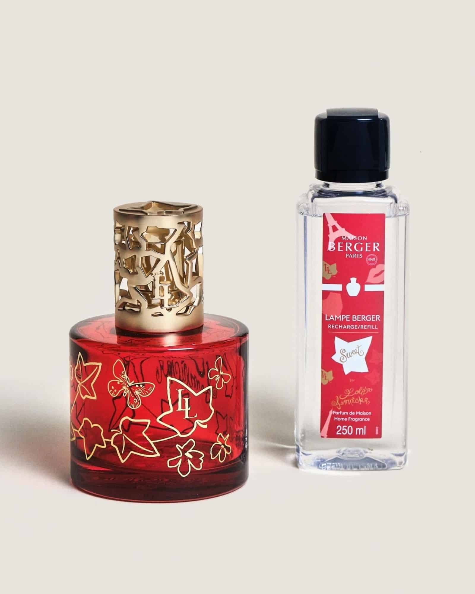 Maison Berger Pure Sweet gåvoset Lolita Lempicka Sweet. Djup röd doftlampa med gyllene detaljer och 250 ml av den lockande doften Lolita Lempicka Sweet som är fruktig, varm och förförisk.