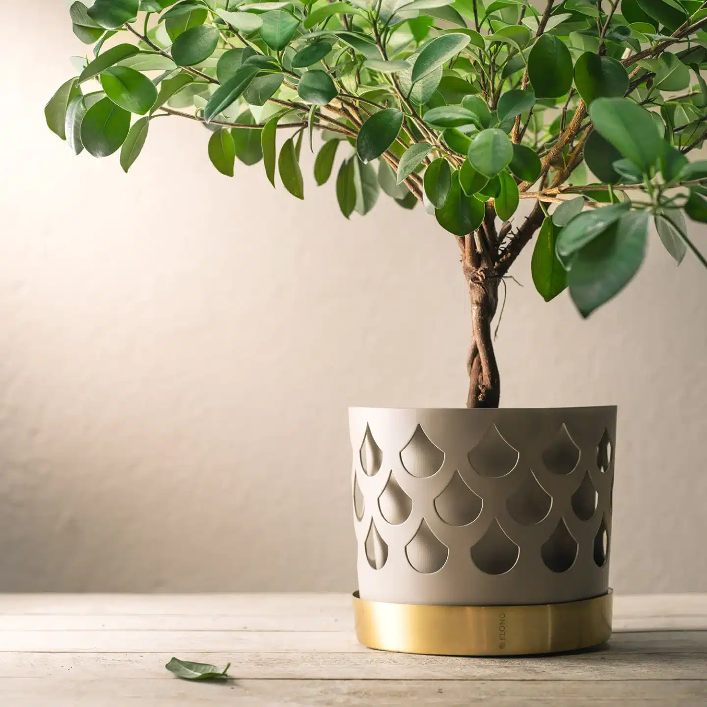 Trio Drop Beige finns i tre storlekar: Liten, Medium och Stor.Det fina genombrutna mönstret till blomkrukorna skapar fint djup och ger karaktär utan att ta uppmärksamhet från växten. Varje kruka har tre delar; innerkruka, ytterkruka samt fat. Krukorna är tillverkade i rostfritt stål och sedan varsamt lackerade för en matt porslinsaktig yta. Fatet är tillverkat i borstad mässing.
