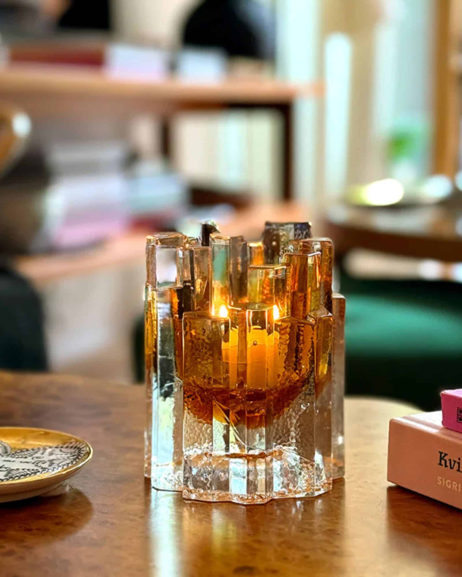 Hurricane Rock Amber från Skogsberg & Smart är en handpressad ljuslykta i kristallglas, inspirerad av Böhmens klippformationer. Varje lykta är unik.