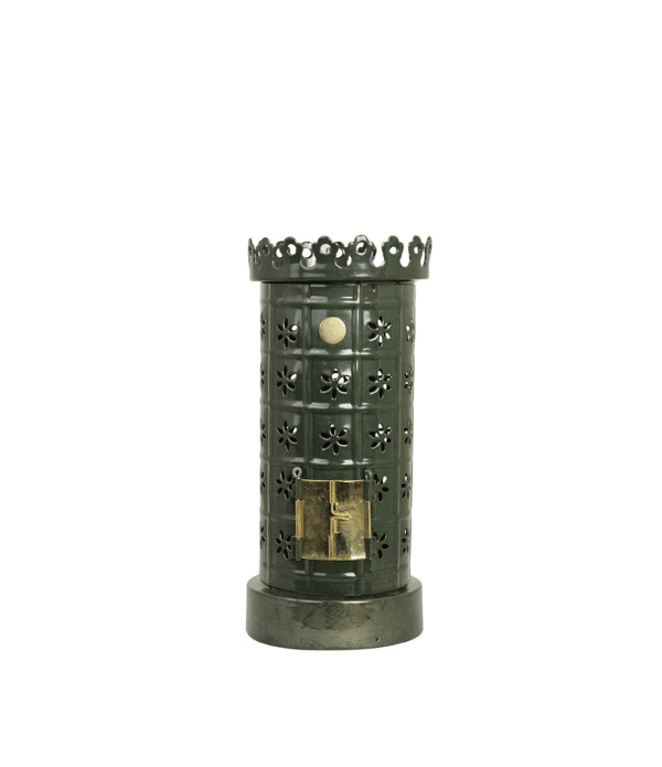 Den mörkgröna marmorerade ytan ger ett elegant och traditionellt uttryck. Samtidigt förstärker de perforerade detaljerna ljusets effekt när ett värmeljus tänds inuti hållaren. Ljuset silas då genom de små öppningarna och skapar ett mjukt och dekorativt sken i rummet. Därför passar ljushållaren perfekt när du vill skapa en mysig stämning under kvällar, middagar eller högtider.