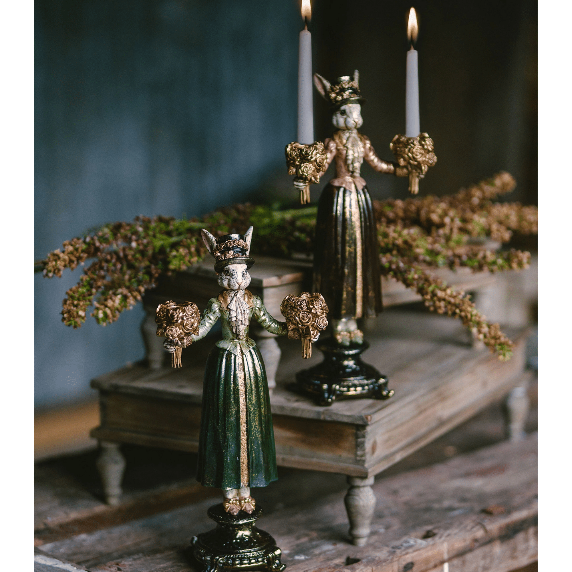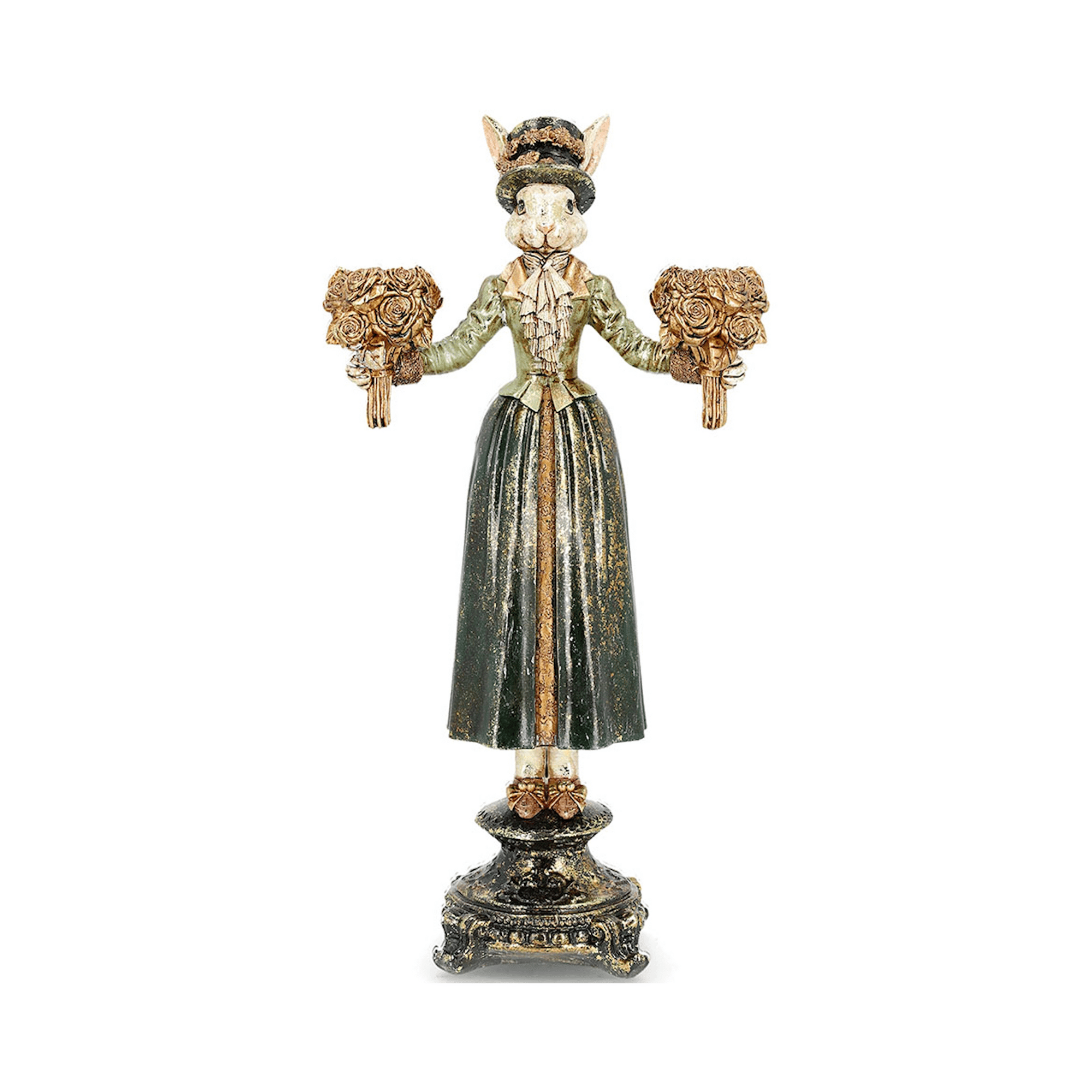 Fru Kanin står elegant klädd i en grön klänning, och dessutom håller hon två vackra buketter i sina händer. I buketterna sitter ljushållarna, anpassade för kronljus, vilket skapar en fantasifull och harmonisk helhet. Därför blir denna ljusstake inte bara en ljuskälla, utan också en konstnärlig dekoration som genast fångar uppmärksamheten.
