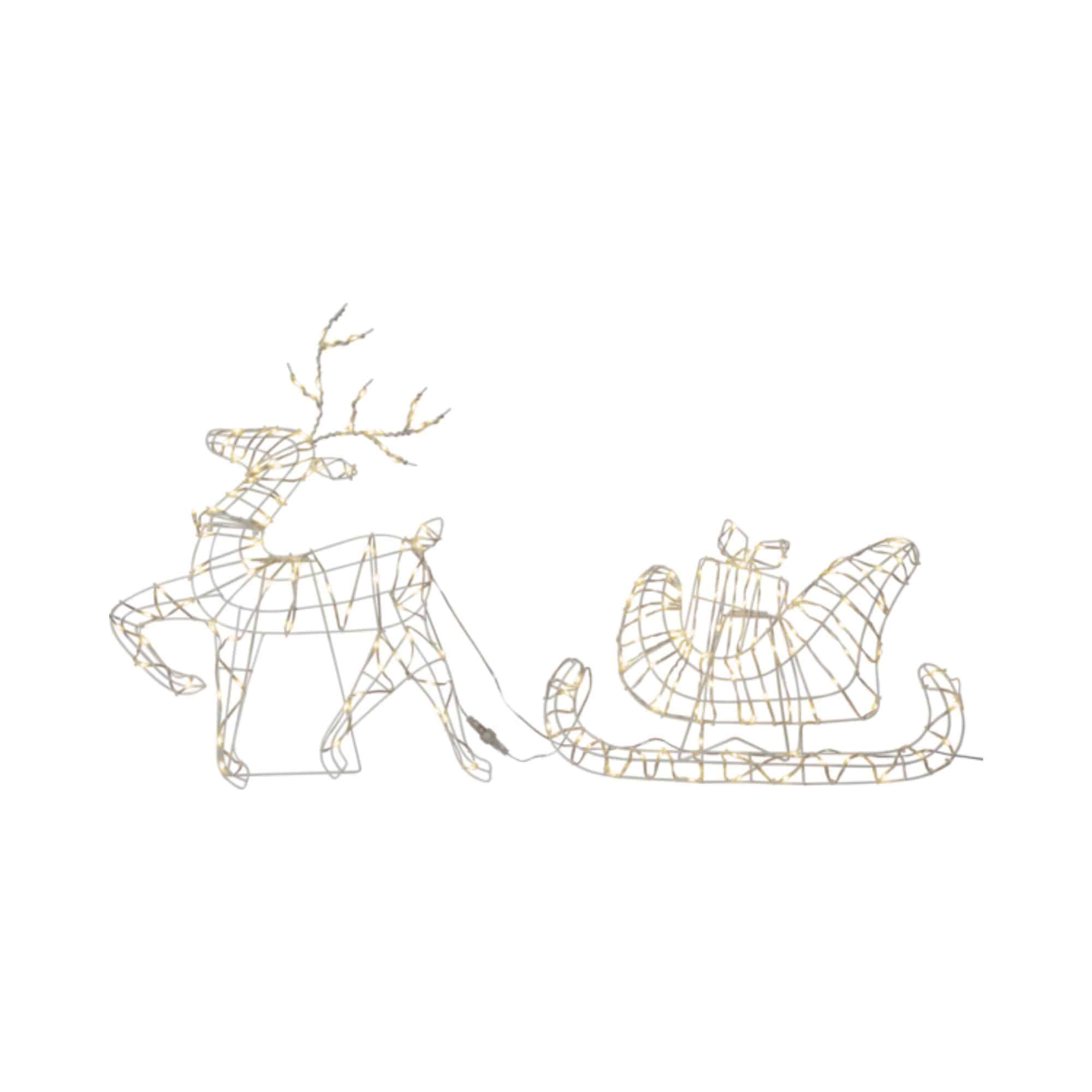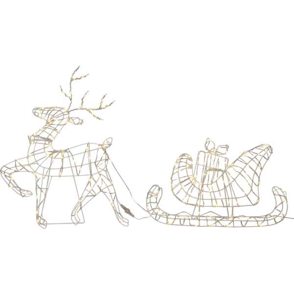 Skapa en glittrande vinter- och julstämning med Siluett Atja, en elegant utomhusdekoration i form av en ren med släde. Tack vare den stilrena metallramen i vit färg och de 160 varmvita LED-ljusen sprider dekorationen ett mjukt och inbjudande sken som lyser upp din trädgård, altan eller entré. Dessutom blir den ett blickfång som fångar uppmärksamheten hos alla som passerar.