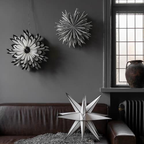 Sputnik 60 vit/svart är snygg och grafisk pappersstjärna med vikningar screentryckta i svart. Häng mitt i rummet, lys upp ett mörkt hörn eller ställ dem på ett sideboard. Bara fantasin sätter gränsen för var denna uttrycksfulla stjärna kan tänkas hamna. Ett genuint hantverk som tillverkas av återvunnet papper.