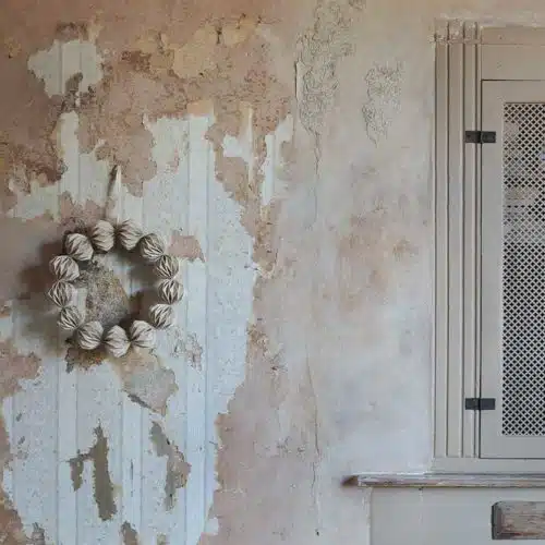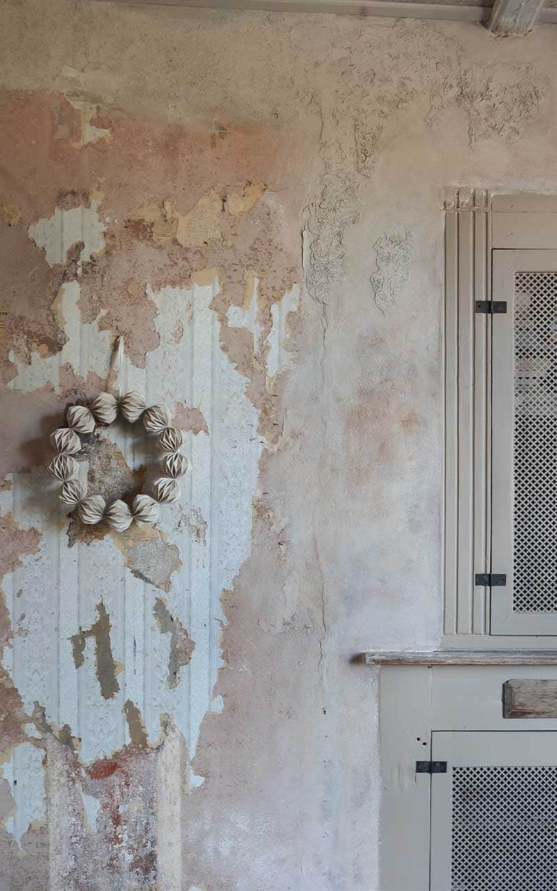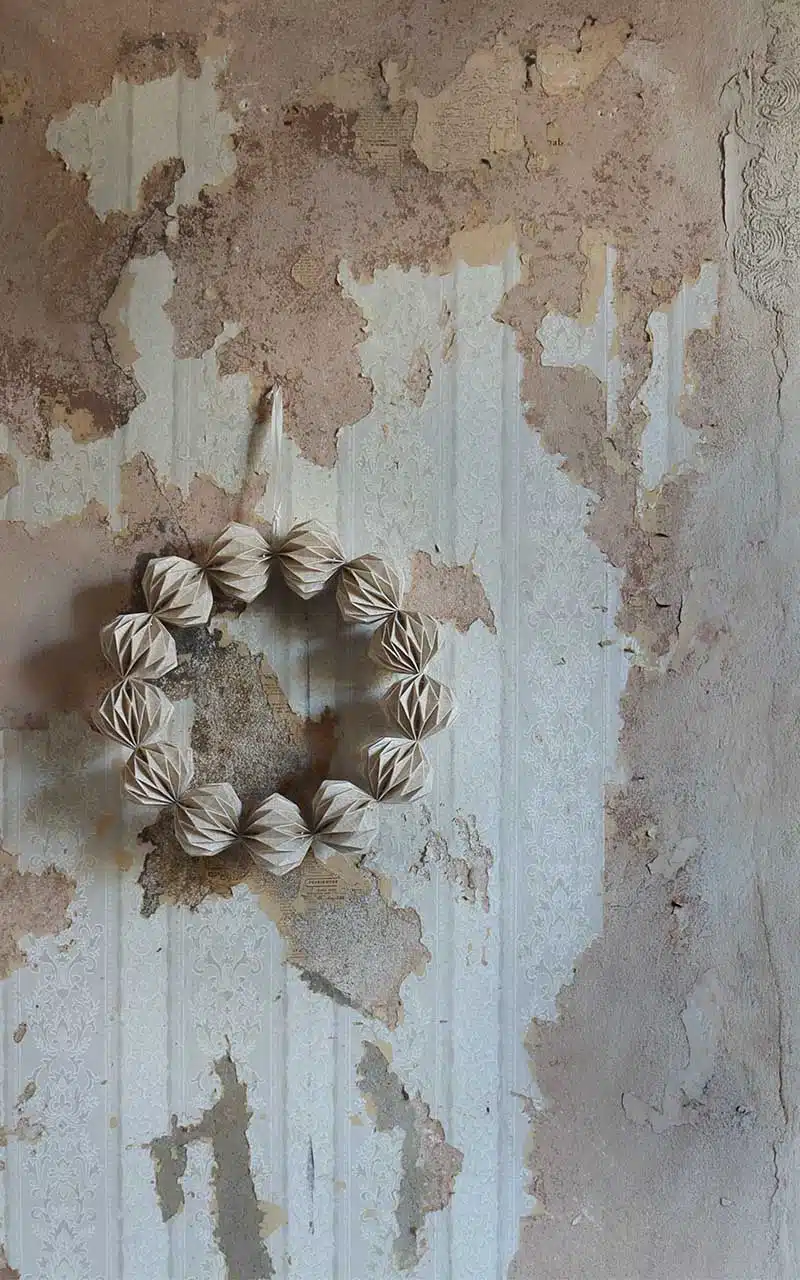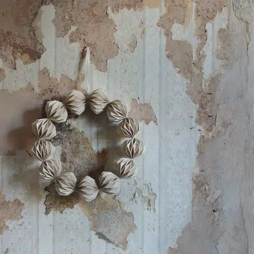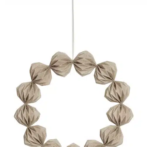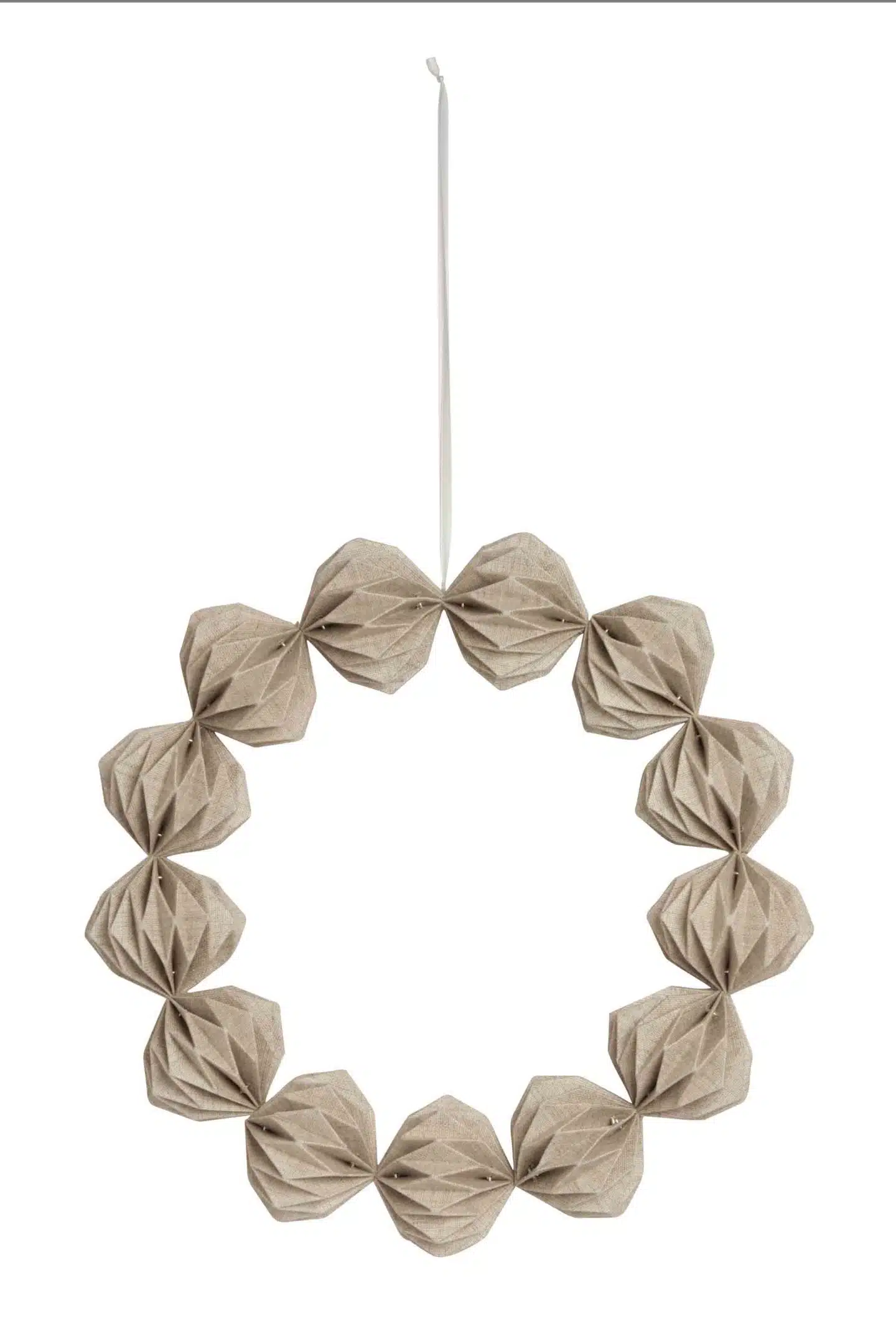 Linn 40 är en vacker, naturfärgad krans med handvikta, fasetterade bollar i papper, täckta med linnetyg. Det grafiska uttrycket ger Linn en modern känsla medans linnetyget andas tradition – precis som den jul vi alla älskar.