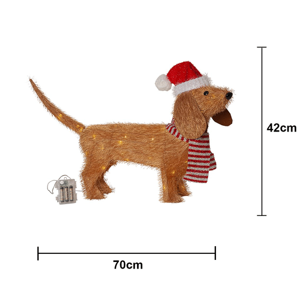 Sprid julglädje med Utomhusdekoration Hund Tecidy, en rolig och söt julhund i textil med 45 varmvita LED-ljus. Med sina mått på 70 × 42 × 22 cm blir den en perfekt dekorationsdetalj som passar både inomhus och under skyddade utomhusmiljöer, som under tak eller veranda, för att skydda tyget och ljusen.