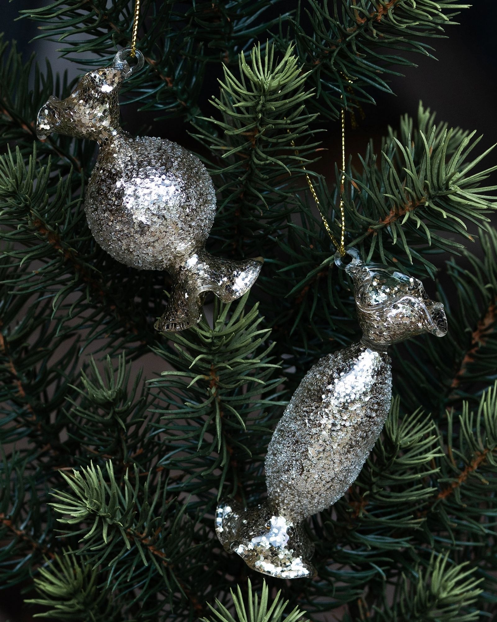 Hänget är tillverkat i glas, vilket ger det en elegant och lite lyxig känsla. Detaljerna är handmålade och glittrande, vilket gör varje karamell till ett litet konstverk. Formen på karamellen varierar – du kan välja mellan en rundare modell eller en mer avlång version. Båda säljs styckvis och är lika dekorativa på egen hand som tillsammans i grupp.