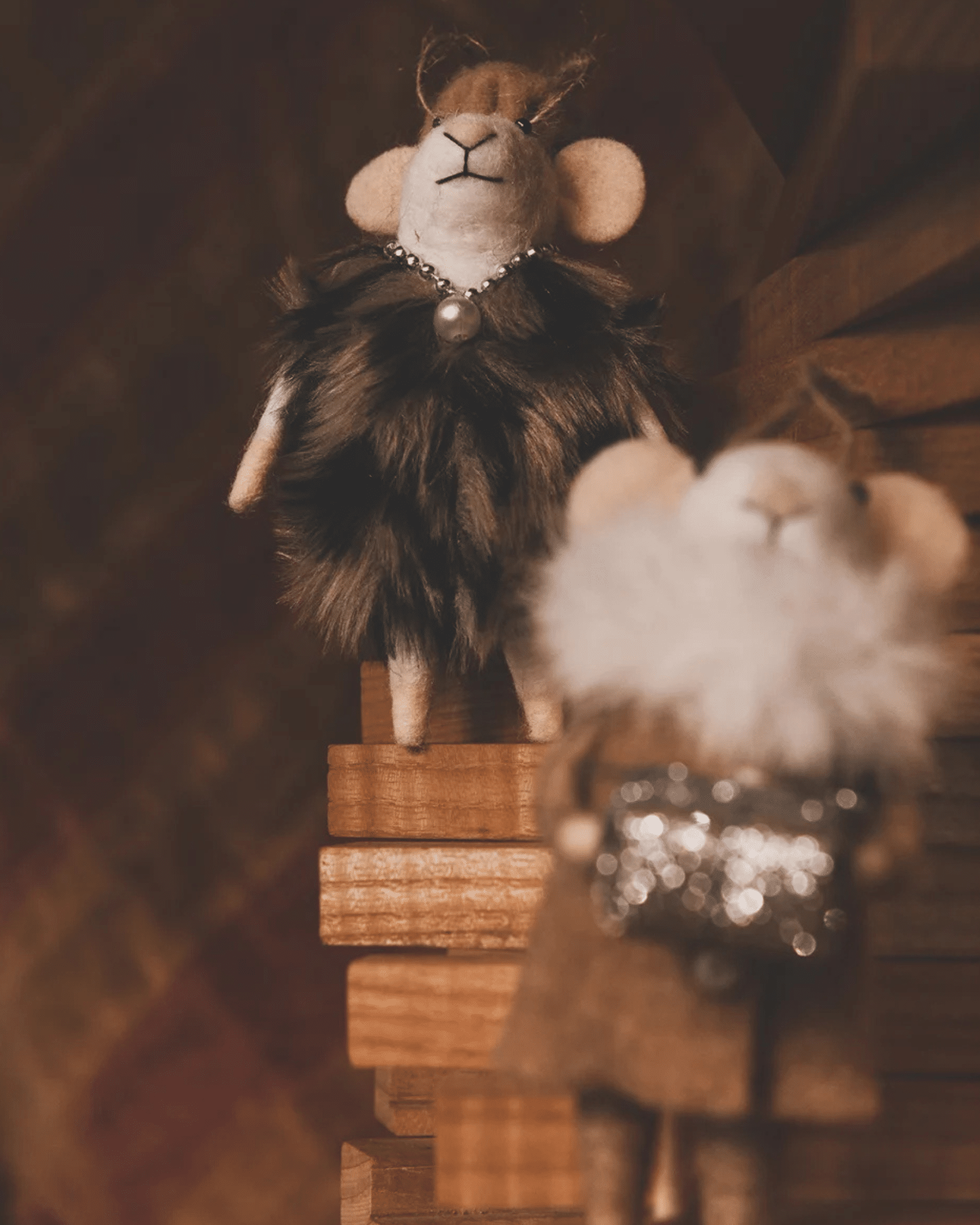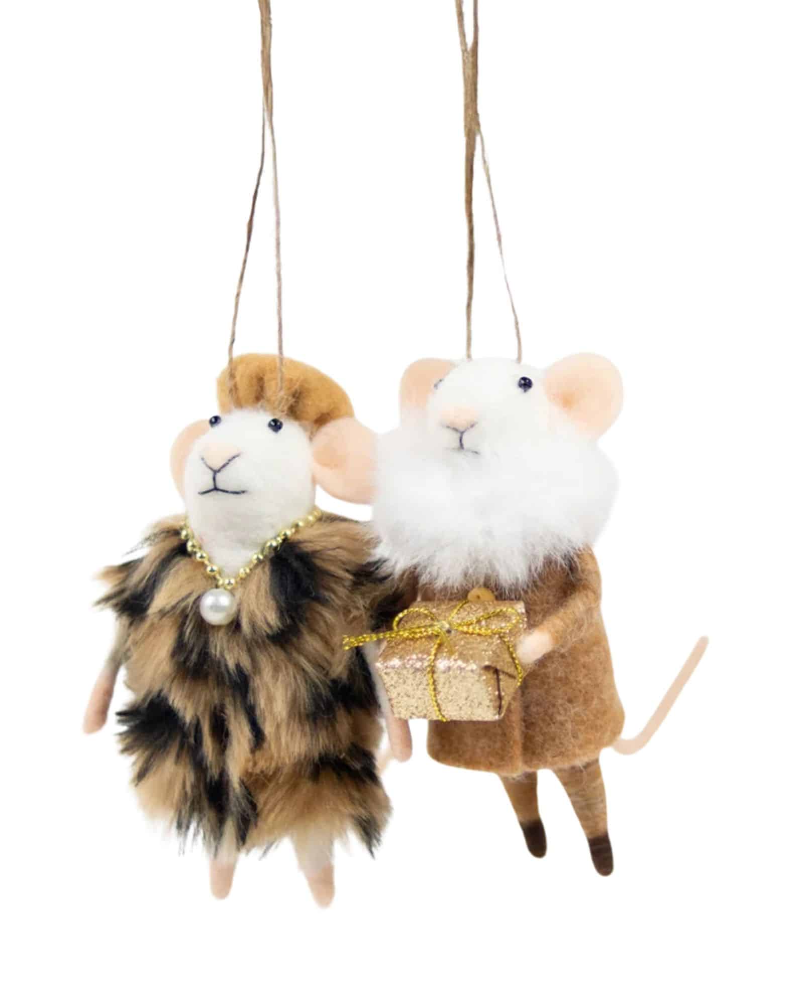 Låt julen få en lekfull och stilfull touch med dessa charmiga vita möss i syntetisk ull. Varje mus är handgjord med unika detaljer som gör den till ett riktigt blickfång i hemmet. Välj mellan två varianter, en mus med leopardkappa eller en med ett inslaget paket, båda lika dekorativa.