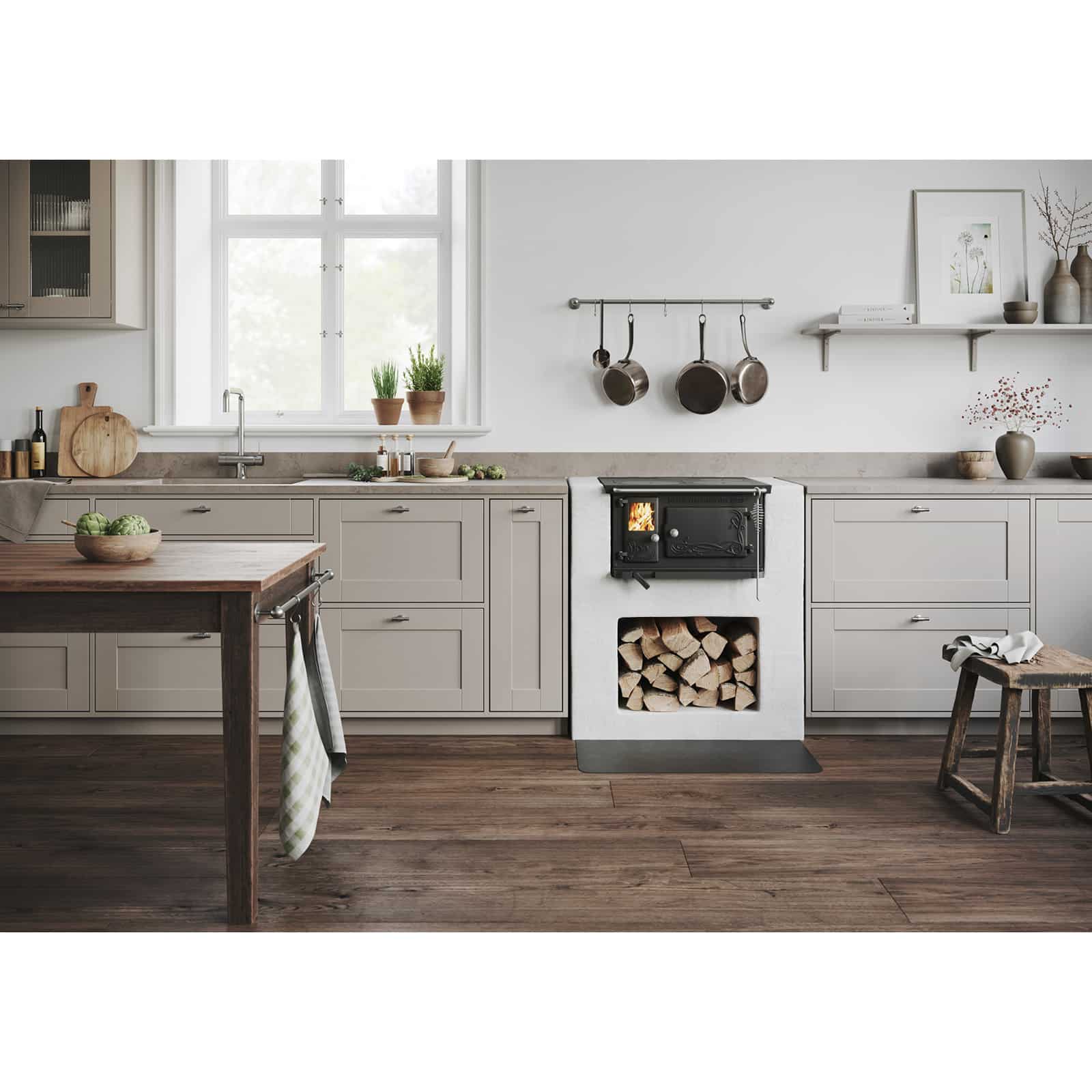 Spisen har kokplattor och en bakugn med täljsten i taket. Täljstenen ger jämn värme och håller värmen länge.