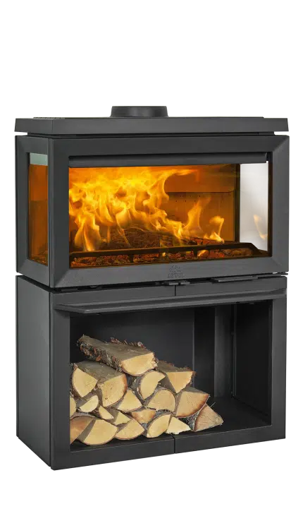 En stor och praktisk braskamin som ger mycket värme. Kaminen har en bred kokplatta på toppen som ger möjlighet till matlagning med flera kastruller. Den har praktiska egenskaper som användarvänliga luftventiler för enkel tändning och värmereglering. Samtliga tre glas är ytbehandlade och kaminen är utrustad med luftspolning, vilket minskar sotbeläggningen. Den har också en ljus eldstadsbeklädnad i massivt gjutjärn. Som helhet ger detta en fin och luftig flambild. I sockeln finns det också gott om plats för förvaring av ved. Med brasbegränsare i förbränningskammaren och ett snäpplås i luckan får du en trygg och säker eldningsupplevelse.