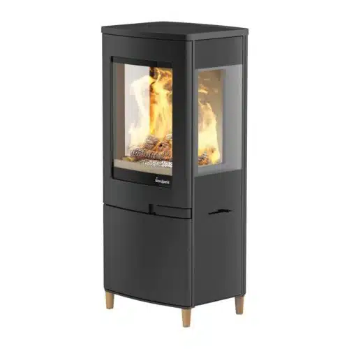 Uno 4 är en liten kamin med sidoglas och ett vedfack med lucka i underdelen. Passar bra i alla bostäder.
