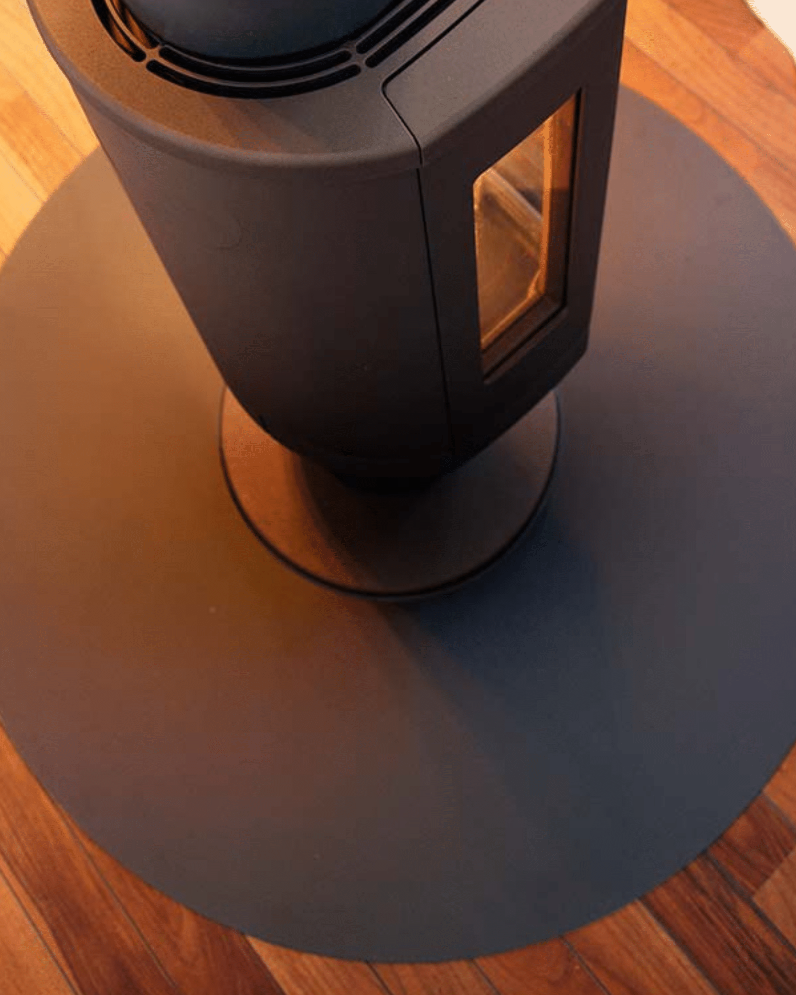 Den svarta finishen ger ett modernt och diskret uttryck. Samtidigt framhäver färgen kaminens design och bidrar till en stilren helhet i rummet. Golvskyddet passar lika bra i moderna hem som i mer klassiska miljöer, vilket gör det till ett mångsidigt val.