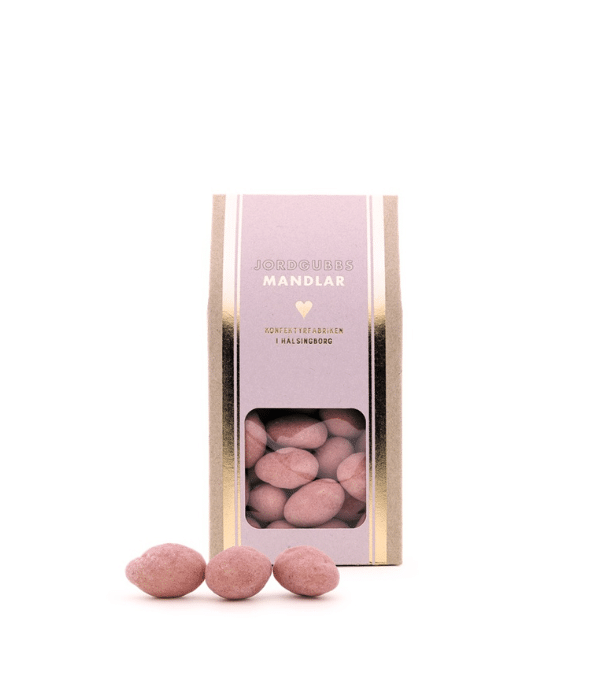 Dessutom passar mandlarna utmärkt i godisskålen på fest eller som en lyxig detalj i presentkorgen. Kombinationen av mandlar, vit choklad och jordgubbspulver gör dem populära hos både vuxna och barn.