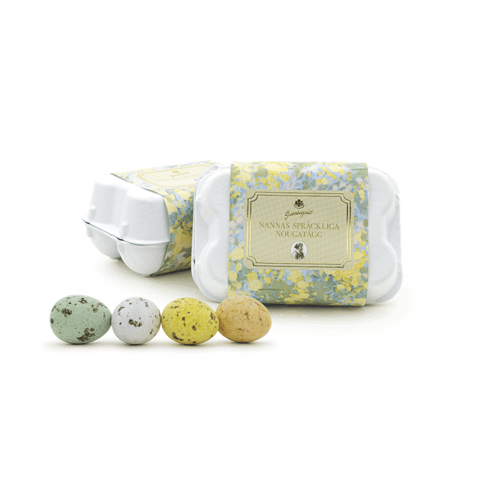 Nannas spräckliga nougatägg är ett exklusivt och lekfullt påskgodis som kombinerar vacker design med fantastisk smak. De spräckliga chokladäggen innehåller len nougat och levereras i en söt liten äggkartong, vilket gör dem till en perfekt och uppskattad gåva att ge bort till påsk.