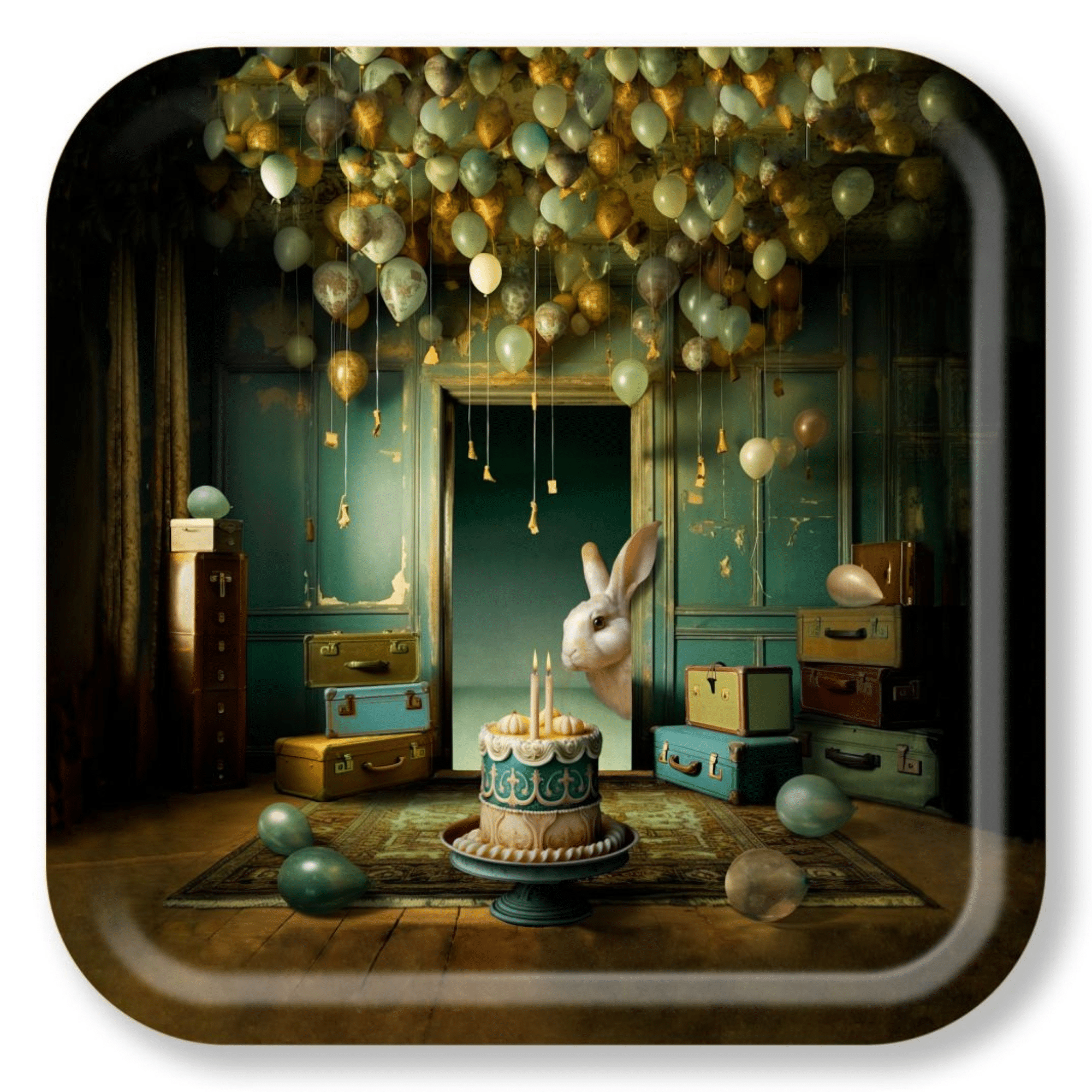 Bricka ”It’s My Party” av Maggie Taylor – handgjord på Öland i FSC-certifierat björkfanér med färgstark, surrealistisk design. Perfekt som serveringsbricka, dekoration eller present.